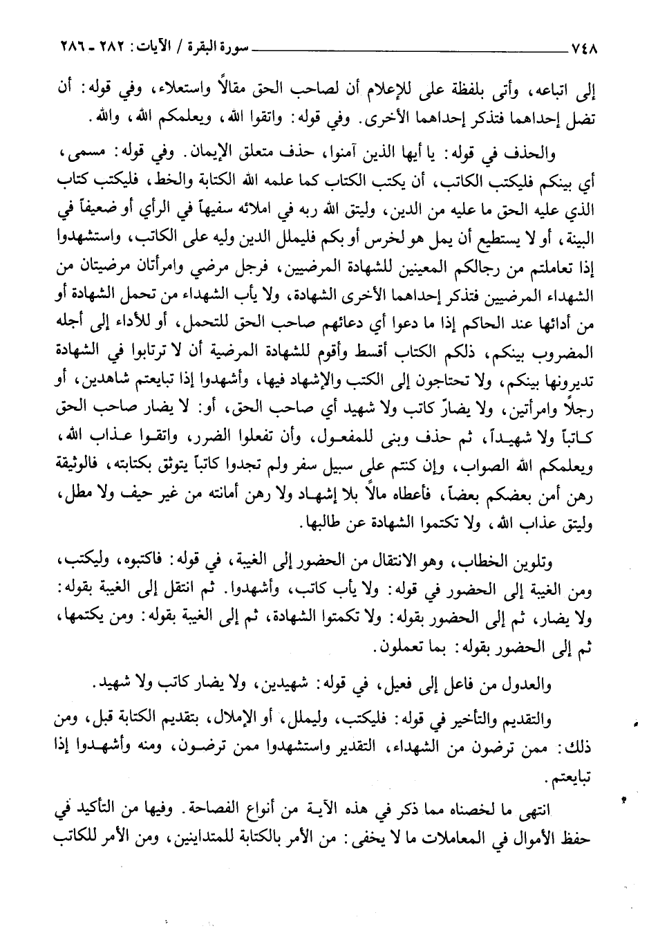 وَالْحَذْفَ فِي قَوْلُهُ: يَا أَيُّهَا الَّذِينَ آمَنُوا، حَذَفَ مُتَعَلِّقَ الْإِيمَانِ. وَفِي قَوْلِهِ: مُسَمًّى، أَيْ بَيْنِكُمْ فَلْيَكْتُبِ الْكَاتِبُ، أَنْ يَكْتُبَ الْكِتَابَ كَمَا عَلَّمَهُ اللَّهُ الْكِتَابَةَ وَالْخَطَّ، فَلْيَكْتُبْ كِتَابَ الَّذِي عَلَيْهِ الْحَقُّ مَا عَلَيْهِ مِنَ الدَّيْنِ، وَلْيَتَّقِ اللَّهَ رَبَّهُ فِي إِمْلَائِهِ سَفِيهًا فِي الرَّأْيِ أَوْ ضَعِيفًا فِي الْبَيِّنَةِ، أَوْ لَا يَسْتَطِيعُ أَنْ يَمَلَّ هُوَ لَخَرَسٍ أَوْ بُكْمٍ فَلْيَمْلَلِ الدَّينَ وَلِيُّهُ عَلَى الْكَاتِبِ، وَاسْتَشْهِدُوا إِذَا تَعَامَلْتُمْ مِنْ رِجَالِكُمُ الْمُعَيَّنِينَ لِلشَّهَادَةِ الْمَرَضِيِّينَ، فَرَجُلٌ مَرْضِيٌّ وَامْرَأَتَانِ مَرْضِيَّتَانِ مِنَ الشُّهَدَاءِ الْمَرْضِيِّينَ فَتُذَكِّرَ إِحْدَاهُمَا الْأُخْرَى الشَّهَادَةَ، وَلَا يَأْبَ الشُّهَدَاءُ مِنْ تَحَمُّلِ الشَّهَادَةِ أَوْ مِنْ أَدَائِهَا عِنْدَ الْحَاكِمِ إِذَا مَا دُعُوا أَيْ دُعَائِهِمْ صَاحِبَ الْحَقِّ لِلتَّحَمُّلِ، أَوْ لِلْأَدَاءِ إِلَى أَجَلِهِ الْمَضْرُوبِ بَيْنَكُمْ، ذَلِكُمُ الْكِتَابُ أَقْسَطُ وَأَقْوَمُ لِلشَّهَادَةِ الْمَرَضِيَّةِ أَنْ لَا تَرْتَابُوا فِي الشَّهَادَةِ تُدِيرُونَهَا بَيْنَكُمْ، وَلَا تَحْتَاجُونَ إِلَى الْكُتُبِ وَالْإِشْهَادِ فِيهَا، وَأَشْهِدُوا إِذَا تَبَايَعْتُمْ شَاهِدَيْنِ، أَوْ رَجُلًا وَامْرَأَتَيْنِ، وَلَا يُضَارَّ كَاتِبٌ وَلَا شَهِيدٌ أَيْ صَاحِبِ الْحَقِّ، أَوْ: لَا يُضَارُّ صَاحِبُ الْحَقِّ كَاتِبًا وَلَا شَهِيدًا، ثُمَّ حُذِفَ وَبُنِيَ لِلْمَفْعُولِ، وَأَنْ تَفْعَلُوا الضَّرَرَ، وَاتَّقَوْا عَذَابَ اللَّهِ، وَيُعَلِّمُكُمُ اللَّهُ الصَّوَابَ، وَإِنْ كُنْتُمْ عَلَى سَبِيلِ سَفَرٍ وَلَمْ تَجِدُوا كَاتِبًا يُتَوَثَّقُ بِكِتَابَتِهِ، فَالْوَثِيقَةُ رَهْنٌ أَمِنَ بَعْضُكُمْ بَعْضًا، فَأَعْطَاهُ مَالًا بِلَا إِشْهَادٍ وَلَا رَهْنٍ أَمَانَتَهُ مِنْ غَيْرِ حَيْفٍ وَلَا مَطَلٍ، وَلْيَتَّقِ عَذَابَ اللَّهِ، وَلَا تَكْتُمُوا الشَّهَادَةَ عَنْ طَالِبِهَا.
