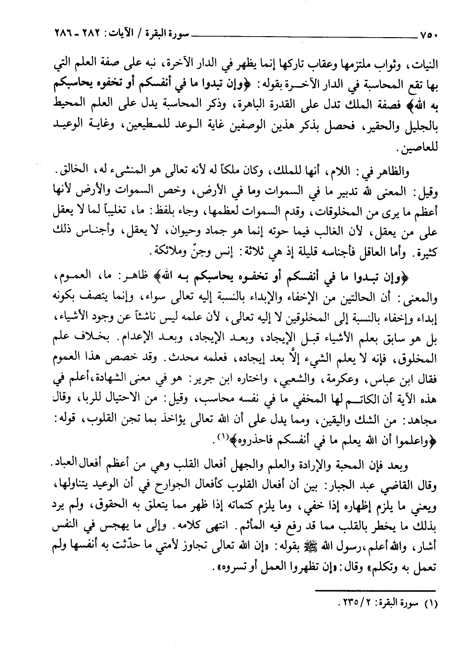 وَإِنْ تُبْدُوا مَا فِي أَنْفُسِكُمْ أَوْ تُخْفُوهُ يُحاسِبْكُمْ بِهِ اللَّهُ ظَاهِرُ: مَا، الْعُمُومُ، وَالْمَعْنَى: أَنَّ الْحَالَتَيْنِ مِنَ الْإِخْفَاءِ وَالْإِبْدَاءِ بِالنِّسْبَةِ إِلَيْهِ تَعَالَى سَوَاءٌ، وَإِنَّمَا يَتَّصِفُ بِكَوْنِهِ إِبْدَاءً وَإِخْفَاءً بِالنِّسْبَةِ إِلَى الْمَخْلُوقِينَ لَا إِلَيْهِ تَعَالَى، لِأَنَّ عِلْمَهُ لَيْسَ نَاشِئًا عَنْ وُجُودِ الْأَشْيَاءِ، بَلْ هُوَ سَابِقٌ بِعِلْمِ الْأَشْيَاءِ قَبْلَ الْإِيجَادِ، وَبَعْدَ الْإِيجَادِ، وَبَعْدَ الْإِعْدَامِ. بِخِلَافِ عِلْمِ الْمَخْلُوقِ، فَإِنَّهُ لَا يَعْلَمُ الشَّيْءَ إِلَّا بَعْدَ إِيجَادِهِ، فَعِلْمُهُ مُحَدَّثٌ. وَقَدْ خُصِّصَ هَذَا الْعُمُومُ فَقَالَ ابْنُ عَبَّاسٍ، وَعِكْرِمَةُ، وَالشَّعْبِيُّ، وَاخْتَارَهُ ابْنُ جَرِيرٍ: هُوَ فِي مَعْنَى الشَّهَادَةٍ، أَعْلَمَ فِي هَذِهِ الْآيَةِ أَنَّ الْكَاتِمَ لَهَا الْمَخْفِي مَا فِي نَفْسِهِ مُحَاسَبٌ، وَقِيلَ: مِنَ الِاحْتِيَالِ لِلرِّبَا، وَقَالَ مُجَاهِدٌ: مِنَ الشَّكِّ وَالْيَقِينِ، وَمِمَّا يَدُلُّ عَلَى أَنَّ اللَّهَ تَعَالَى يُؤَاخِذُ بِمَا تَجْنِ الْقُلُوبُ، قَوْلُهُ: