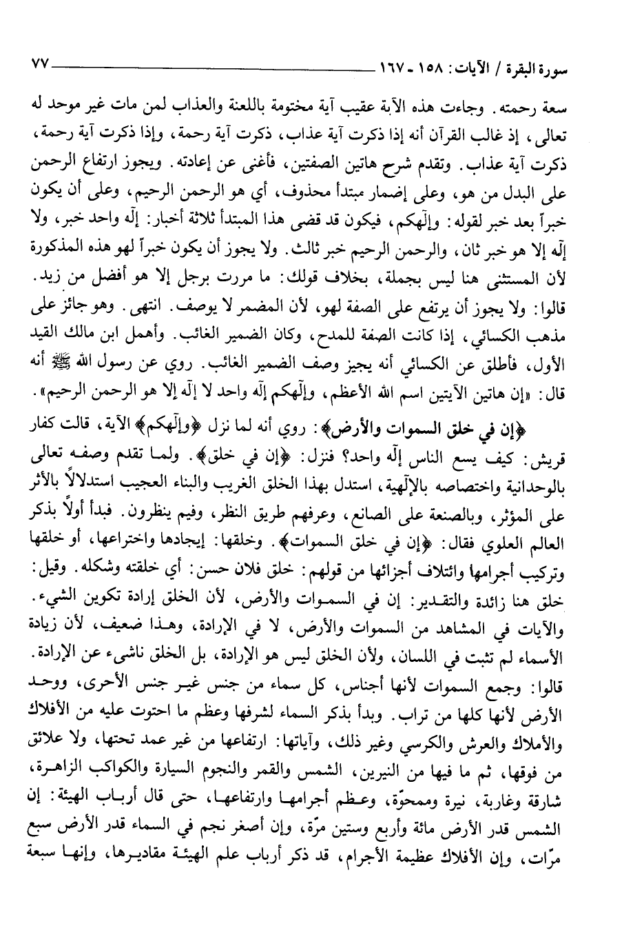 سِعَةِ رَحْمَتِهِ. وَجَاءَتْ هَذِهِ الْآيَةُ عَقِيبَ آيَةٍ مَخْتُومَةٍ بِاللَّعْنَةِ وَالْعَذَابِ لِمَنْ مَاتَ غَيْرَ مُوَحِّدٍ لَهُ تَعَالَى، إِذْ غَالِبُ الْقُرْآنِ أَنَّهُ إِذَا ذُكِرَتْ آيَةُ عَذَابٍ، ذُكِرَتْ آيَةُ رَحْمَةٍ، وَإِذَا ذُكِرَتْ آيَةُ رَحْمَةٍ، ذُكِرَتْ آيَةُ عَذَابٍ. وَتَقَدَّمَ شَرْحُ هَاتَيْنِ الصِّفَتَيْنِ، فَأَغْنَى عَنْ إِعَادَتِهِ. وَيَجُوزُ ارْتِفَاعُ الرَّحْمَنِ عَلَى الْبَدَلِ مِنْ هُوَ، وَعَلَى إِضْمَارِ مُبْتَدَأٍ مَحْذُوفٍ، أَيْ هُوَ الرَّحْمَنُ الرَّحِيمُ، وَعَلَى أَنْ يَكُونَ خَبَرًا بَعْدَ خَبَرٍ لِقَوْلِهِ: وَإِلَهُكُمْ، فَيَكُونُ قَدْ قَضَى هَذَا الْمُبْتَدَأَ ثَلَاثَةَ أَخْبَارٍ: إِلَهٌ وَاحِدٌ خَبَرٌ، وَلَا إِلَهَ إِلَّا هُوَ خَبَرٌ ثَانٍ، وَالرَّحْمَنُ الرَّحِيمُ خَبَرٌ ثَالِثٌ. وَلَا يَجُوزُ أَنْ يَكُونَ خَبَرًا لِهُوَ هَذِهِ الْمَذْكُورَةِ لِأَنَّ الْمُسْتَثْنَى هُنَا لَيْسَ بِجُمْلَةٍ، بِخِلَافِ قَوْلِكَ: مَا مَرَرْتُ بِرَجُلٍ إِلَّا هُوَ أَفْضَلُ مِنْ زَيْدٍ.