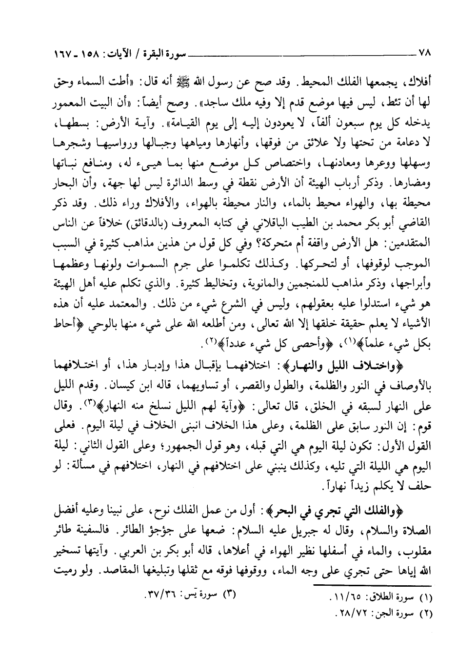 وَآيَةُ الْأَرْضِ: بَسْطُهَا، لَا دِعَامَةَ مِنْ تَحْتِهَا وَلَا عَلَائِقَ مِنْ فَوْقِهَا، وَأَنْهَارُهَا وَمِيَاهُهَا وَجِبَالُهَا وَرَوَاسِيهَا وَشَجَرُهَا وَسَهْلُهَا وَوَعْرُهَا وَمَعَادِنُهَا، وَاخْتِصَاصُ كُلِّ مَوْضِعٍ مِنْهَا بما هيىء لَهُ، وَمَنَافِعُ نَبَاتِهَا وَمَضَارُّهَا. وَذَكَرَ أَرْبَابُ الْهَيْئَةِ أَنَّ الْأَرْضَ نُقْطَةٌ فِي وَسَطِ الدَّائِرَةِ لَيْسَ لَهَا جِهَةٌ، وَأَنَّ الْبِحَارَ مُحِيطَةٌ بِهَا، وَالْهَوَاءَ مُحِيطٌ بِالْمَاءِ، وَالنَّارَ مُحِيطَةٌ بِالْهَوَاءِ، وَالْأَفْلَاكَ وَرَاءَ ذَلِكَ. وَقَدْ ذَكَرَ الْقَاضِي أَبُو بَكْرٍ مُحَمَّدُ بْنُ الطَّيِّبِ الْبَاقِلَّانِيُّ فِي كِتَابِهِ الْمَعْرُوفِ (بِالدَّقَائِقِ) خِلَافًا عَنِ النَّاسِ الْمُتَقَدِّمِينَ: هَلِ الْأَرْضُ وَاقِفَةٌ أَمْ مُتَحَرِّكَةٌ؟ وَفِي كُلِّ قَوْلٍ مِنْ هَذَيْنِ مَذَاهِبُ كَثِيرَةٌ فِي السَّبَبِ الْمُوجِبِ لِوُقُوفِهَا، أَوْ لِتَحَرُّكِهَا. وَكَذَلِكَ تَكَلَّمُوا عَلَى جِرْمِ السموات وَلَوْنِهَا وَعِظَمِهَا وَأَبْرَاجِهَا، وَذَكَرَ مَذَاهِبَ لِلْمُنَجِّمِينَ وَالْمَانَوِيَّةِ، وَتَخَالِيطَ كَثِيرَةً. وَالَّذِي تَكَلَّمَ عَلَيْهِ أَهْلُ الْهَيْئَةِ هُوَ شَيْءٌ اسْتَدَلُّوا عَلَيْهِ بِعُقُولِهِمْ، وَلَيْسَ فِي الشَّرْعِ شَيْءٌ مِنْ ذَلِكَ. وَالْمُعْتَمَدُ عَلَيْهِ أَنَّ هَذِهِ الْأَشْيَاءَ لَا يَعْلَمُ حَقِيقَةَ خَلْقِهَا إِلَّا اللَّهُ تَعَالَى، وَمَنْ أَطْلَعَهُ اللَّهُ عَلَى شَيْءٍ مِنْهَا بِالْوَحْيِ أَحاطَ بِكُلِّ شَيْءٍ عِلْماً «1» ، وَأَحْصى كُلَّ شَيْءٍ عَدَداً «2» .