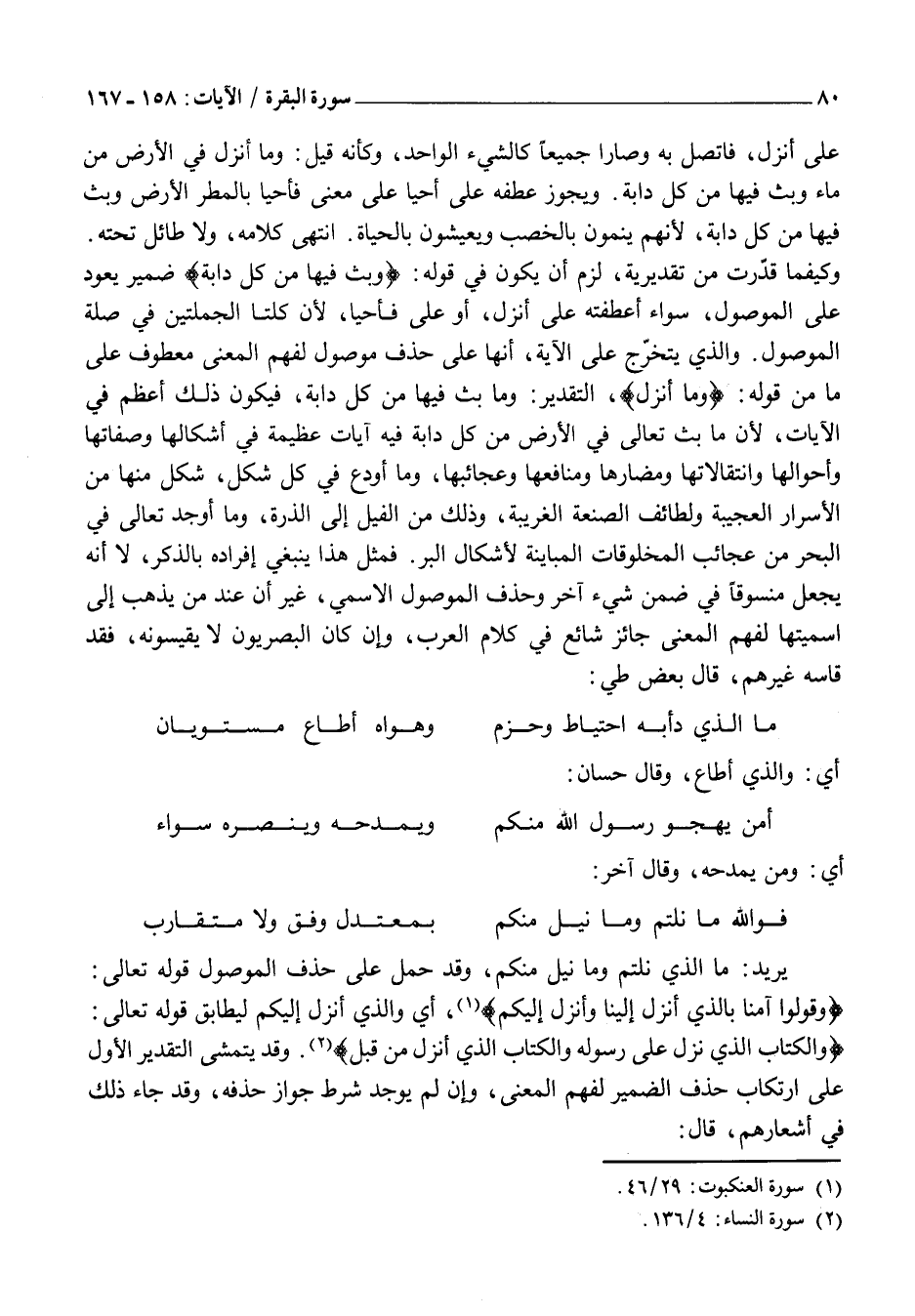 وَالْكِتابِ الَّذِي نَزَّلَ عَلى رَسُولِهِ وَالْكِتابِ الَّذِي أَنْزَلَ مِنْ قَبْلُ «2» . وَقَدْ يَتَمَشَّى التَّقْدِيرُ الْأَوَّلُ عَلَى ارْتِكَابِ حَذْفِ الضَّمِيرِ لِفَهْمِ الْمَعْنَى، وَإِنْ لَمْ يُوجَدْ شَرْطُ جَوَازِ حَذْفِهِ، وَقَدْ جَاءَ ذَلِكَ فِي أَشْعَارِهِمْ، قال: