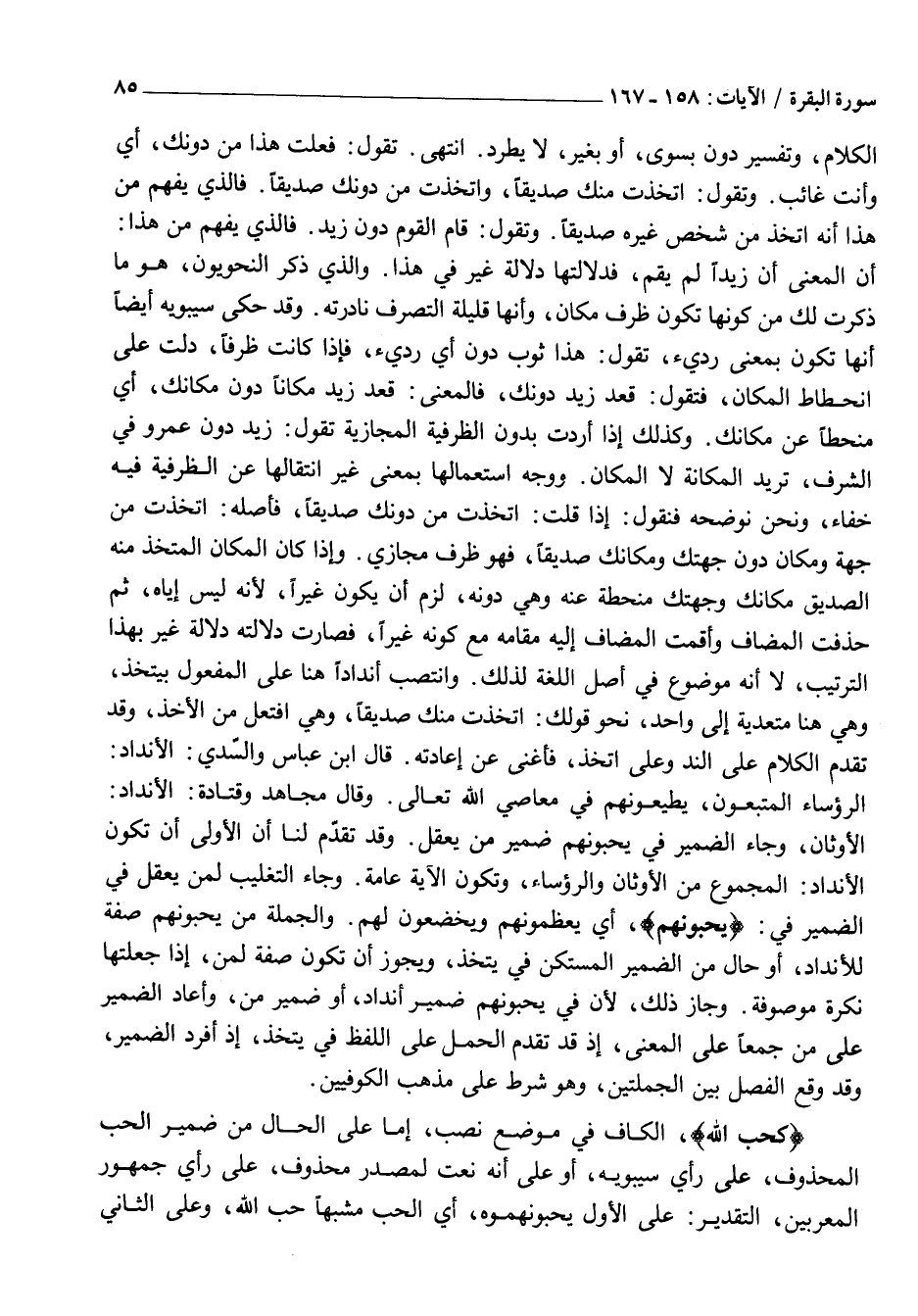الْأَوْثَانُ، وَجَاءَ الضَّمِيرُ فِي يُحِبُّونَهُمْ ضَمِيرُ مَنْ يَعْقِلُ. وَقَدْ تَقَدَّمَ لَنَا أَنَّ الْأَوْلَى أَنْ تَكُونَ الْأَنْدَادُ: الْمَجْمُوعَ مِنَ الْأَوْثَانِ وَالرُّؤَسَاءِ، وَتَكُونُ الْآيَةُ عَامَّةً. وَجَاءَ التَّغْلِيبُ لِمَنْ يَعْقِلُ فِي الضَّمِيرِ فِي: يُحِبُّونَهُمْ، أَيْ يُعَظِّمُونَهُمْ وَيَخْضَعُونَ لَهُمْ. وَالْجُمْلَةُ مِنْ يُحِبُّونَهُمْ صِفَةٌ لِلْأَنْدَادِ، أَوْ حَالٌ مِنَ الضَّمِيرِ الْمُسْتَكِنِّ فِي يَتَّخِذُ، وَيَجُوزُ أَنْ تَكُونَ صِفَةً لِمَنْ، إِذَا جَعَلْتَهَا نَكِرَةً مَوْصُوفَةً. وَجَازَ ذَلِكَ، لِأَنَّ فِي يُحِبُّونَهُمْ ضَمِيرَ أَنْدَادٍ، أَوْ ضَمِيرَ مَنْ، وَأَعَادَ الضَّمِيرَ عَلَى مَنْ جَمْعًا عَلَى الْمَعْنَى، إِذْ قَدْ تَقَدَّمَ الْحَمْلُ عَلَى اللَّفْظِ فِي يَتَّخِذُ، إِذْ أَفْرَدَ الضَّمِيرَ، وَقَدْ وَقَعَ الْفَصْلُ بَيْنَ الْجُمْلَتَيْنِ، وَهُوَ شَرْطٌ عَلَى مَذْهَبِ الْكُوفِيِّينَ.
