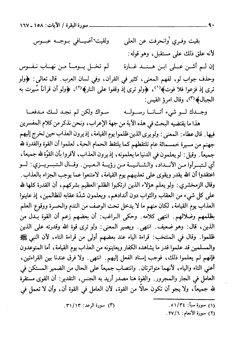 هَذَا مَا يَقْتَضِيهِ الْبَحْثُ فِي هَذِهِ الْآيَةِ مِنْ جِهَةِ الْإِعْرَابِ، وَنَحْنُ نَذْكُرُ مِنْ كَلَامِ المفسرين فيها. قَالَ عَطَاءٌ: الْمَعْنَى: وَلَوْ يَرَى الَّذِينَ ظَلَمُوا يَوْمَ الْقِيَامَةِ، إِذْ يَرَوْنَ الْعَذَابَ حِينَ تَخْرُجُ إِلَيْهِمْ جَهَنَّمُ مِنْ مَسِيرَةِ خَمْسِمِائَةِ عَامٍ تَلْتَقِطُهُمْ كَمَا يَلْتَقِطُ الْحَمَامُ الْحَبَّةَ، لَعَلِمُوا أَنَّ الْقُوَّةَ وَالْقُدْرَةَ لِلَّهِ جَمِيعًا. وَقِيلَ: لَوْ يَعْلَمُونَ فِي الدُّنْيَا مَا يَعْلَمُونَهُ، إِذْ يَرَوْنَ الْعَذَابَ، لَأَقَرُّوا بِأَنَّ الْقُوَّةَ لله جميعا، أي لتبرأوا مِنَ الْأَنْدَادِ، وَالثَّانِيَةُ مِنْ رُؤْيَةِ الْعَيْنِ. وَقَالَ التَّبْرِيزِيُّ: لَوِ اعْتَقَدُوا أَنَّ اللَّهَ يَقْدِرُ وَيَقْوَى عَلَى تَعْذِيبِهِمْ يَوْمَ الْقِيَامَةِ، لَامْتَنَعُوا عَمَّا يُوجِبُ الْجَزَاءَ بِالْعَذَابِ.