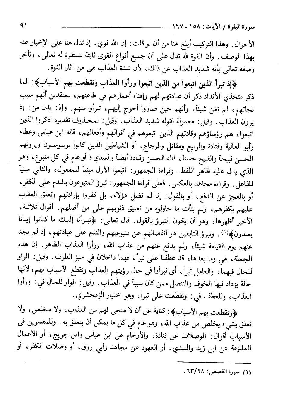 وَتَقَطَّعَتْ بِهِمُ الْأَسْبابُ: كِنَايَةٌ عَنْ أَنَّ لَا مَنْجَى لَهُمْ مِنَ الْعَذَابِ، وَلَا مُخَلِّصَ، وَلَا تَعَلُّقَ بِشَيْءٍ يُخَلِّصُ مِنْ عَذَابِ اللَّهِ، وَهُوَ عَامٌّ فِي كُلِّ مَا يُمْكِنُ أَنْ يَتَعَلَّقَ بِهِ. وَلِلْمُفَسِّرِينَ فِي الْأَسْبَابِ أَقْوَالٌ: الْوَصَلَاتُ عَنْ قَتَادَةَ، وَالْأَرْحَامُ عَنِ ابْنِ عَبَّاسٍ وَابْنِ جُرَيْجٍ، أَوِ الْأَعْمَالُ الملتزمة عَنِ ابْنِ زَيْدٍ وَالسُّدِّيِّ، أَوِ الْعُهُودُ عَنْ مُجَاهِدٍ وَأَبِي رَوْقٍ، أَوْ وَصَلَاتُ الكفر، أو