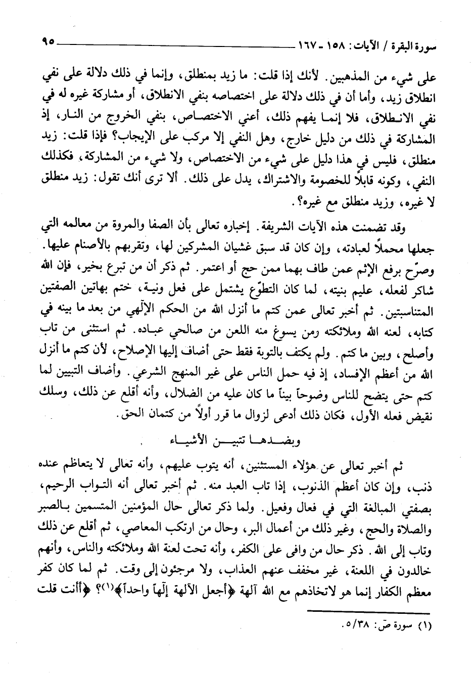وَصَرَّحَ بِرَفْعِ الْإِثْمِ عَمَّنْ طَافَ بِهِمَا مِمَّنْ حَجَّ أَوِ اعْتَمَرَ. ثُمَّ ذَكَرَ أَنَّ مَنْ تَبَرَّعَ بِخَيْرٍ، فَإِنَّ اللَّهَ شَاكِرٌ لِفِعْلِهِ، عَلِيمٌ بِنِيَّتِهِ، لَمَّا كَانَ التَّطَوُّعُ يَشْتَمِلُ عَلَى فِعْلٍ وَنِيَّةٍ، خَتَمَ بِهَاتَيْنِ الصِّفَتَيْنِ الْمُتَنَاسِبَتَيْنِ. ثُمَّ أَخْبَرَ تَعَالَى عَمَّنْ كَتَمَ مَا أَنْزِلَ اللَّهُ مِنْ الْحُكْمِ الْإِلَهِيِّ مِنْ بَعْدِ مَا بَيَّنَهُ فِي كِتَابِهِ، لَعَنَهُ اللَّهُ وَمَلَائِكَتُهُ وَمَنْ يُسَوَّغُ مِنْهُ اللَّعْنُ مِنْ صَالِحِي عِبَادِهِ. ثُمَّ اسْتَثْنَى مَنْ تَابَ وَأَصْلَحُ، وَبَيَّنَ مَا كَتَمَ. وَلَمْ يَكْتَفِ بِالتَّوْبَةِ فَقَطْ حَتَّى أَضَافَ إِلَيْهَا الْإِصْلَاحَ، لِأَنَّ كَتْمَ مَا أَنْزَلَ اللَّهُ مِنْ أَعْظَمِ الْإِفْسَادِ، إِذْ فِيهِ حَمْلُ النَّاسِ عَلَى غَيْرِ الْمِنْهَجِ الشَّرْعِيِّ. وَأَضَافَ التَّبْيِينَ لِمَا كَتَمَ حَتَّى يَتَّضِحَ لِلنَّاسِ وُضُوحًا بَيِّنًا مَا كَانَ عَلَيْهِ مِنَ الضَّلَالِ، وَأَنَّهُ أَقْلَعَ عَنْ ذَلِكَ، وَسَلَكَ نَقِيضَ فِعْلِهِ الْأَوَّلِ، فَكَانَ ذَلِكَ أَدْعَى لِزَوَالِ مَا قَرَّرَ أَوَّلًا مِنْ كِتْمَانِ الْحَقِّ.