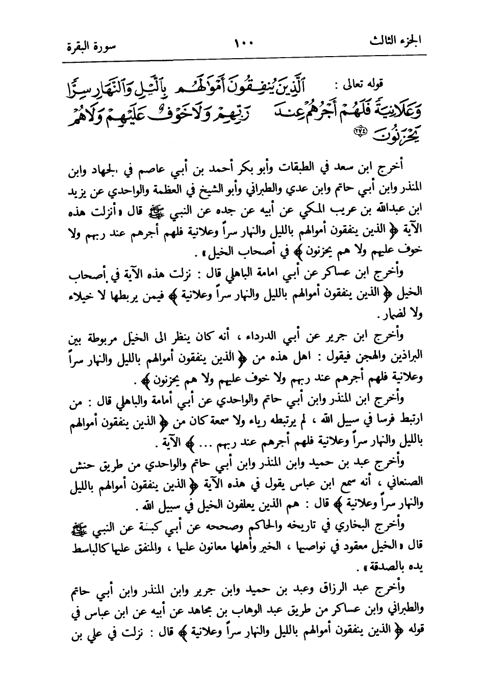 وَأخرج عبد بن حميد وَابْن الْمُنْذر وَابْن أبي حَاتِم والواحدي من طَرِيق حَنش الصَّنْعَانِيّ أَنه سمع ابْن عَبَّاس يَقُول فِي هَذِه الْآيَة {الَّذين يُنْفقُونَ أَمْوَالهم بِاللَّيْلِ وَالنَّهَار سرا وَعَلَانِيَة} قَالَ: هم الَّذين يعلفون الْخَيل فِي سَبِيل الله