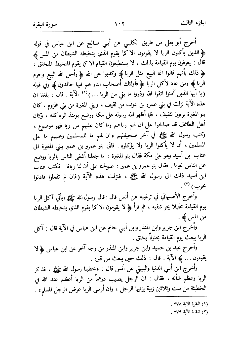 قَالَ: بلغنَا أَن هَذِه الْآيَة نزلت فِي بني عَمْرو بن عَوْف من ثَقِيف وَبني الْمُغيرَة من بني مَخْزُوم كَانَ بَنو الْمُغيرَة يربون لثقيف فَلَمَّا أظهر الله رَسُوله على مَكَّة وَوضع يَوْمئِذٍ الرِّبَا كُله وَكَانَ أهل الطَّائِف قد صَالحُوا على أَن لَهُم رباهم وَمَا كَانَ عَلَيْهِم من رَبًّا فَهُوَ مَوْضُوع وَكتب رَسُول الله صلى الله عَلَيْهِ وَسلم فِي آخر صحيفتهم أَن لَهُم مَا للْمُسلمين وَعَلَيْهِم مَا على الْمُسلمين أَن لَا يَأْكُلُوا الرِّبَا وَلَا يؤكلوه