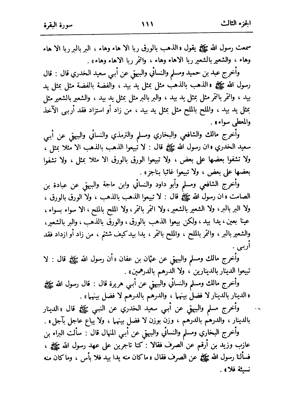 وَأخرج الشَّافِعِي وَمُسلم وَأَبُو دَاوُد وَالنَّسَائِيّ وَابْن ماجة وَالْبَيْهَقِيّ عَن عبَادَة بن الصَّامِت أَن رَسُول الله صلى الله عَلَيْهِ وَسلم قَالَ: لَا تَبِيعُوا الذَّهَب بِالذَّهَب وَلَا الْوَرق بالورق وَلَا الْبر بِالْبرِّ وَلَا الشّعير بِالشَّعِيرِ وَلَا التَّمْر بِالتَّمْرِ وَلَا الْملح بالملح إِلَّا سَوَاء بِسَوَاء عينا بِعَين يدا بيد وَلَكِن بيعوا الذَّهَب بالورق وَالْوَرق بِالذَّهَب وَالْبر بِالشَّعِيرِ وَالشعِير بِالْبرِّ وَالتَّمْر بالملح وَالْملح بِالتَّمْرِ يدا بيد كَيفَ شِئْتُم من زَاد أَو ازْدَادَ فقد أربى
