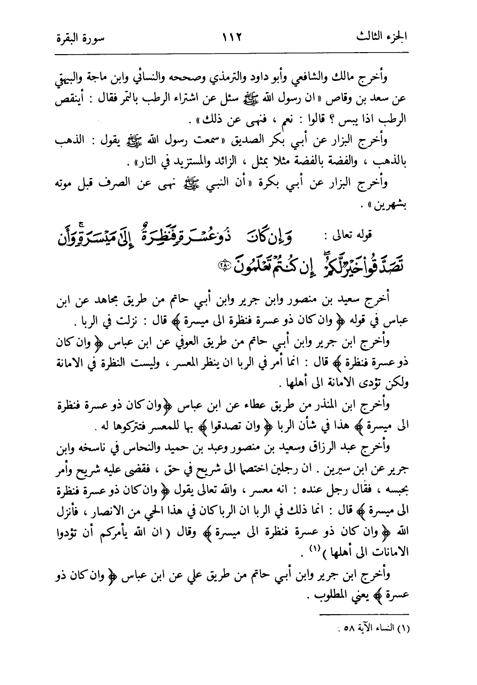 وَأخرج ابْن جرير وَابْن أبي حَاتِم من طَرِيق الْعَوْفِيّ عَن ابْن عَبَّاس {وَإِن كَانَ ذُو عسرة فنظرة} قَالَ: إِنَّمَا أَمر فِي الرِّبَا أَن ينظر الْمُعسر وَلَيْسَت النظرة فِي الْأَمَانَة وَلَكِن تُؤَدّى الْأَمَانَة إِلَى أَهلهَا