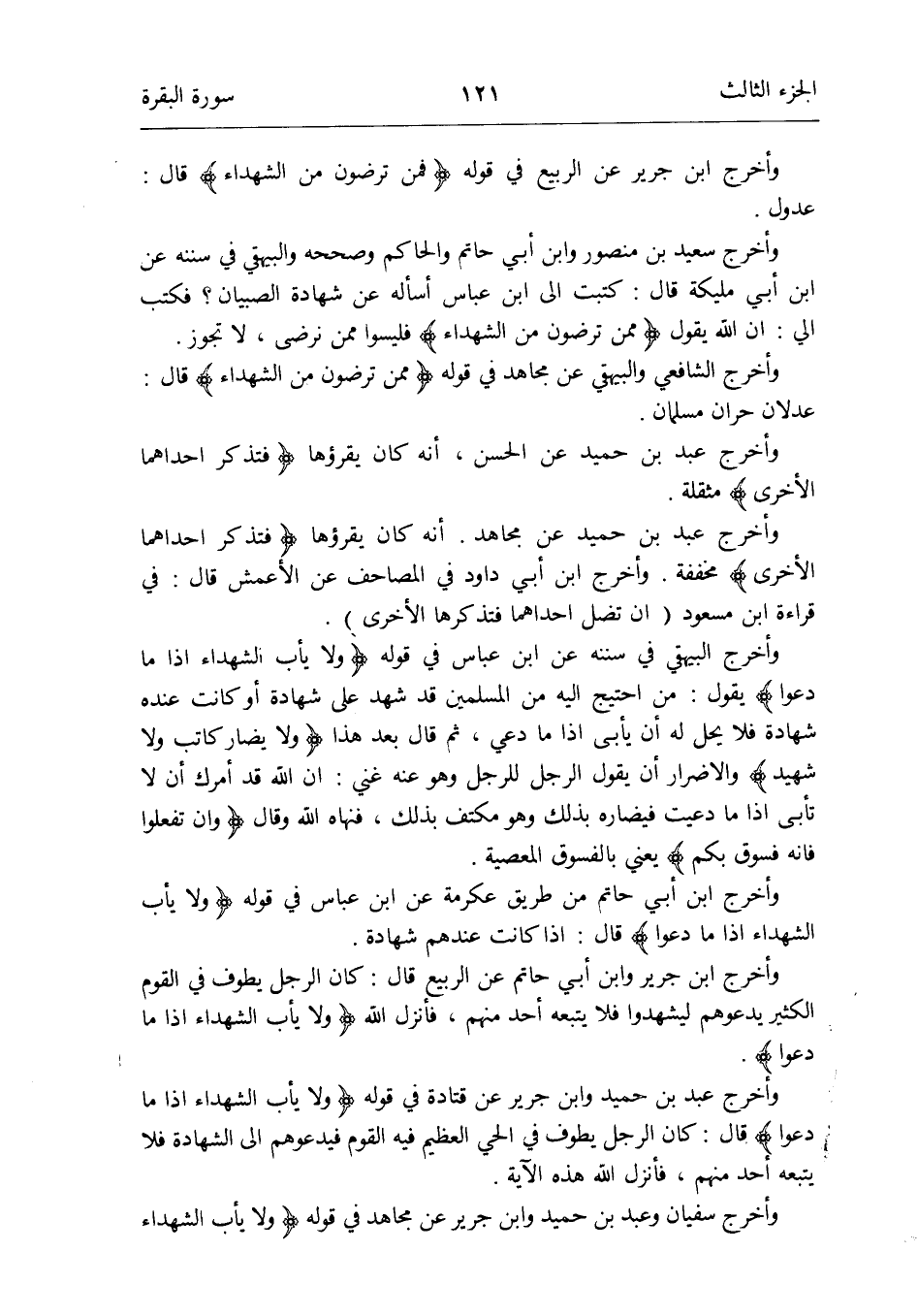 وَأخرج الْبَيْهَقِيّ فِي سنَنه عَن ابْن عَبَّاس فِي قَوْله {وَلَا يأب الشُّهَدَاء إِذا مَا دعوا} يَقُول: من احْتِيجَ إِلَيْهِ من الْمُسلمين قد شهد على شَهَادَة أَو كَانَت عِنْده شَهَادَة فَلَا يحل لَهُ أَن يَأْبَى إِذا مَا دعِي ثمَّ قَالَ بعد هَذَا {وَلَا يضار كَاتب وَلَا شَهِيد} والأضرار أَن يَقُول الرجل للرجل وَهُوَ عَنهُ غَنِي: إِن الله قد أَمرك أَن لَا تأبى إِذا مَا دعيت فيضاره بذلك وَهُوَ مكتف بذلك فَنَهَاهُ الله وَقَالَ {وَإِن تَفعلُوا فَإِنَّهُ فسوق بكم} يَعْنِي بالفسوق الْمعْصِيَة