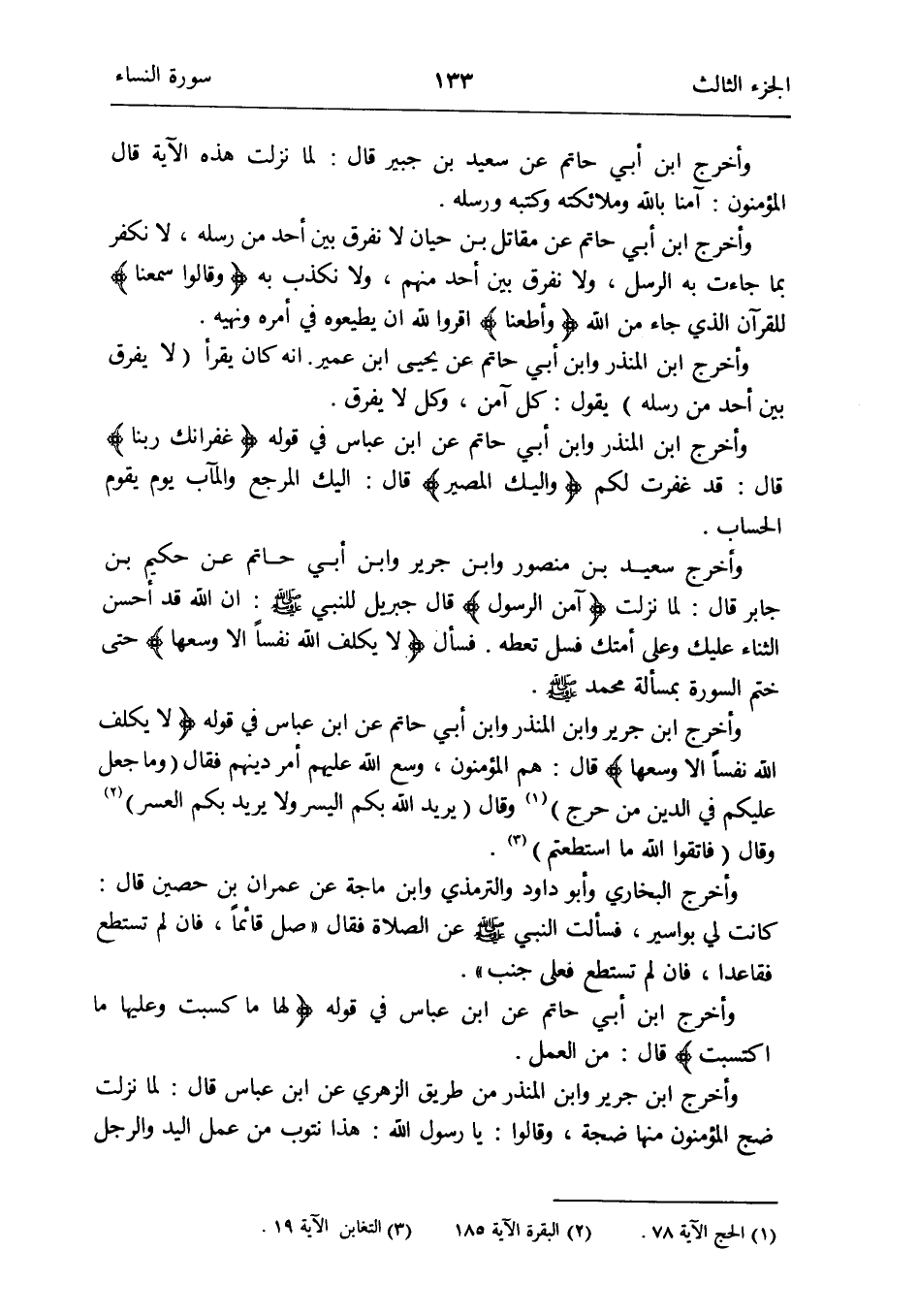 وَأخرج ابْن جرير وَابْن الْمُنْذر وَابْن أبي حَاتِم عَن ابْن عَبَّاس فِي قَوْله {لَا يُكَلف الله نفسا إِلَّا وسعهَا} قَالَ: هم الْمُؤْمِنُونَ وسع الله عَلَيْهِم أَمر دينهم فَقَالَ (وَمَا جعل عَلَيْكُم فِي الدّين من حرج) (الْحَج الْآيَة 78) وَقَالَ (يُرِيد الله بكم الْيُسْر وَلَا يُرِيد بكم الْعسر) (الْبَقَرَة الْآيَة 185) وَقَالَ (فَاتَّقُوا الله مَا اسْتَطَعْتُم) (التغابن الْآيَة 19)