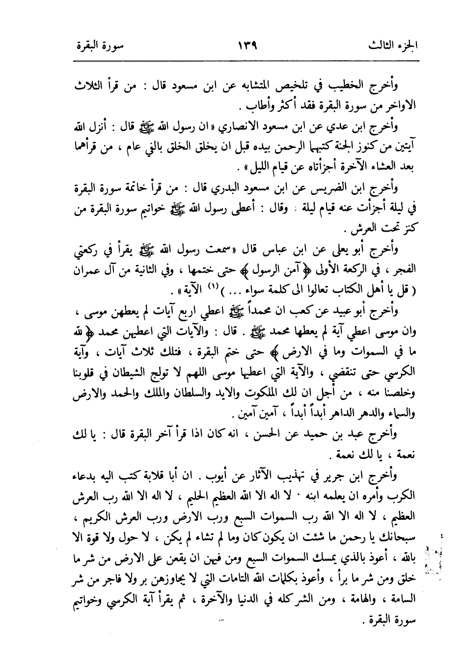 وَأخرج الْخَطِيب فِي تَلْخِيص الْمُتَشَابه عَن ابْن مَسْعُود قَالَ: من قَرَأَ الثَّلَاث الْأَوَاخِر من سُورَة الْبَقَرَة فقد أَكثر وأطاب