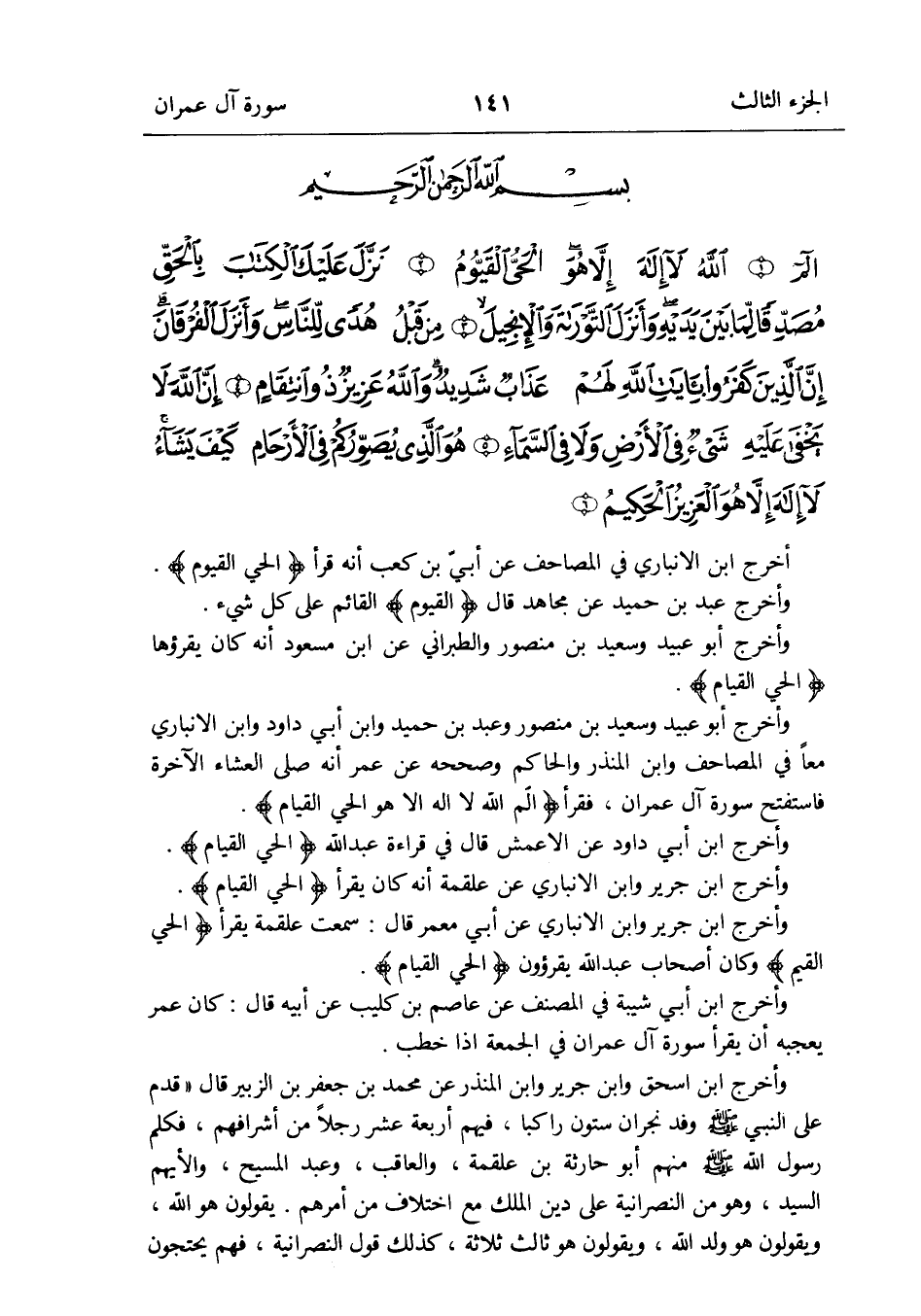 وَأخرج أَبُو عبيد وَسَعِيد بن مَنْصُور وَعبد بن حميد وَابْن أبي دَاوُد وَابْن الْأَنْبَارِي مَعًا فِي الْمَصَاحِف وَابْن الْمُنْذر وَالْحَاكِم وَصَححهُ عَن عمر أَنه صلى الْعشَاء الْآخِرَة فَاسْتَفْتَحَ سُورَة آل عمرَان فَقَرَأَ {الم الله لَا إِلَه إِلَّا هُوَ الْحَيّ القيوم}