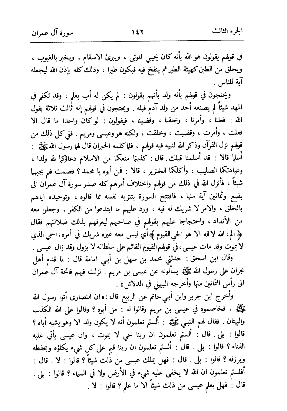 قَالَ: كذبتما منعكما من الإِسلام دعاؤكما لله ولدا وعبادتكما الصَّلِيب وأكلكما الْخِنْزِير قَالَا: فَمن أَبوهُ يَا مُحَمَّد فَصمت فَلم يجبهما شَيْئا فَأنْزل الله فِي ذَلِك من قَوْلهم وَاخْتِلَاف أَمرهم كُله صدر سُورَة آل عمرَان إِلَى بضع وَثَمَانِينَ آيَة مِنْهَا فَافْتتحَ السُّورَة بتنزيه نَفسه مِمَّا قَالُوهُ وتوحيده إيَّاهُم بالخلق وَالْأَمر لَا شريك لَهُ فِيهِ ورد عَلَيْهِم مَا ابتدعوا من الْكفْر وَجعلُوا مَعَه من الأنداد واحتجاجاً عَلَيْهِم بقَوْلهمْ فِي صَاحبهمْ ليعرفهم بذلك ضلالته فَقَالَ {الم الله لَا إِلَه إِلَّا هُوَ الْحَيّ القيوم} أَي لَيْسَ مَعَه غَيره شريك فِي أمره الْحَيّ الَّذِي لَا يَمُوت وَقد مَاتَ عِيسَى فِي قَوْلهم القيوم الْقَائِم على سُلْطَانه لَا يَزُول وَقد زَالَ عِيسَى