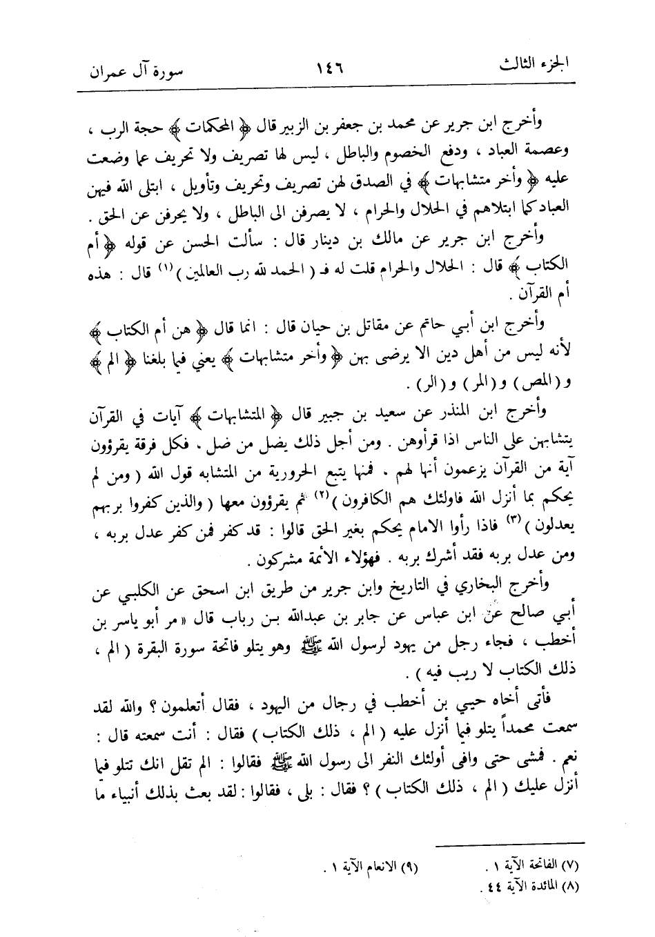 وَأخرج ابْن أبي حَاتِم عَن مقَاتل بن حَيَّان قَالَ: إِنَّمَا قَالَ {هن أم الْكتاب} لِأَنَّهُ لَيْسَ من أهل دين إِلَّا يرضى بِهن {وَأخر متشابهات} يَعْنِي فِيمَا بلغنَا {الم} و (المص) و (المر) و (الر)