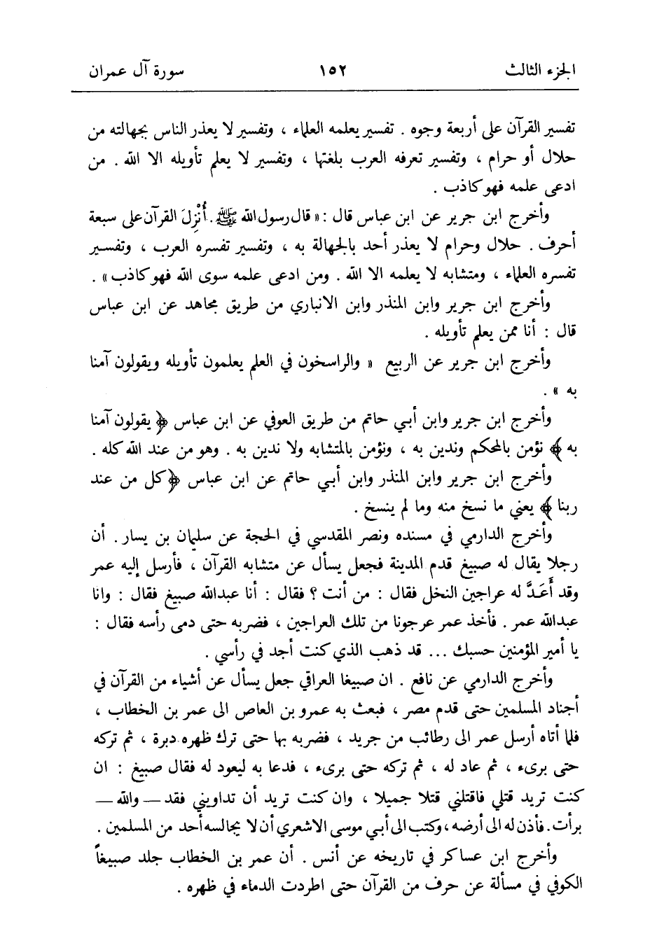 ن وَأخرج ابْن جرير عَن ابْن عَبَّاس قَالَ: قَالَ رَسُول الله صلى الله عَلَيْهِ وَسلم: أُنْزِلَ الْقُرْآن على سَبْعَة أحرف: حَلَال وَحرَام لَا يعْذر أحد بالجهالة بِهِ وَتَفْسِير تفسره الْعَرَب وَتَفْسِير تفسره الْعلمَاء ومتشابه لَا يُعلمهُ إِلَّا الله