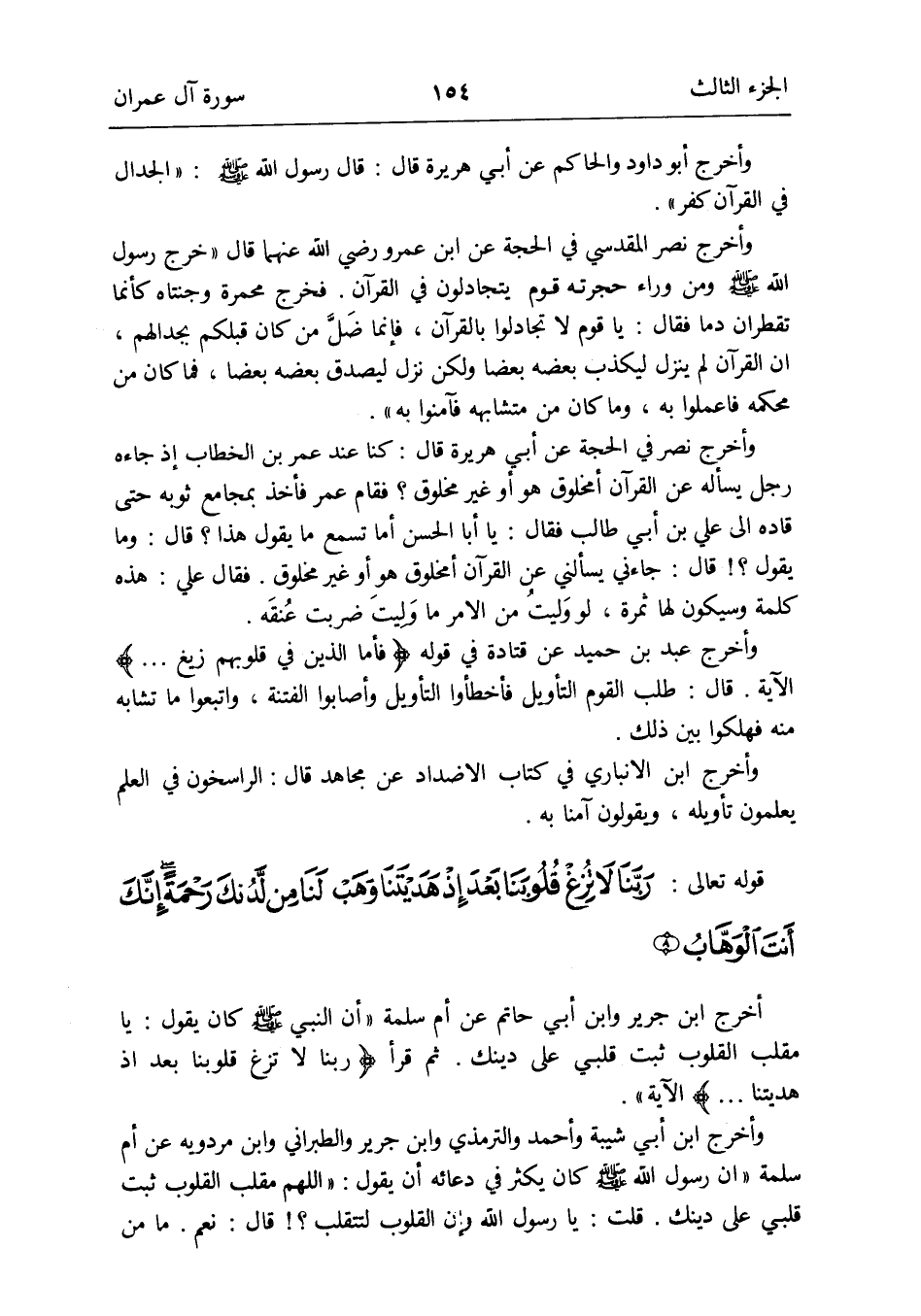أخرج ابْن جرير وَابْن أبي حَاتِم عَن أم سَلمَة أَن النَّبِي صلى الله عَلَيْهِ وَسلم كَانَ يَقُول: يَا مُقَلِّب الْقُلُوب ثَبت قلبِي على دينك