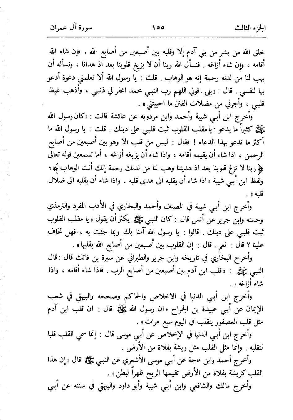 فَقَالَ: لَيْسَ من قلب إِلَّا وَهُوَ بَين أصبعين من أَصَابِع الرَّحْمَن إِذا شَاءَ أَن يقيمه أَقَامَهُ وَإِذا شَاءَ أَن يزيغه أزاغه أما تسمعين قَوْله تَعَالَى {رَبنَا لَا تزغ قُلُوبنَا بعد إِذْ هديتنا وهب لنا من لَدُنْك رَحْمَة إِنَّك أَنْت الْوَهَّاب} وَلَفظ ابْن أبي شيبَة إِذا شَاءَ أَن يقلبه إِلَى هدى قلبه وَإِذا شَاءَ أَن يقلبه إِلَى ضلال قلبه