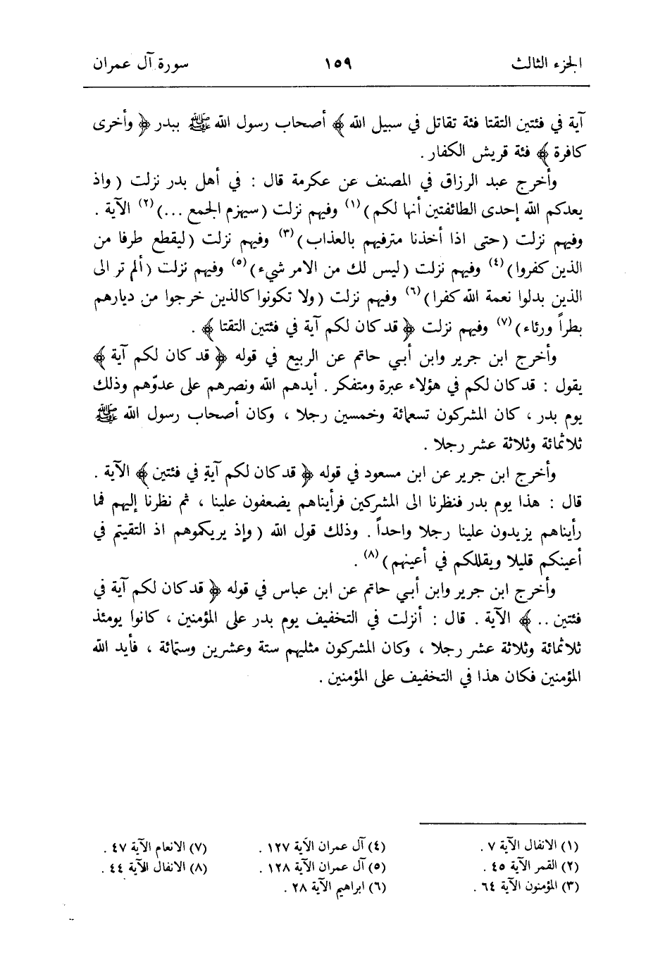 وأخرج ابْن جرير وابْن أبي حَاتِم عَن ابْن عَبَّاس فِي قَوْله {قد كَانَ لكم آيَة فِي فئتين} الْآيَة