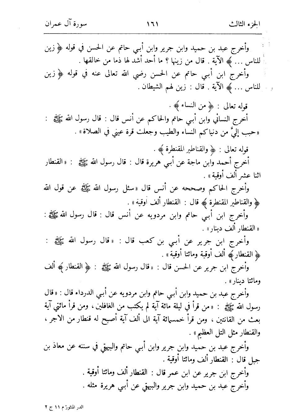 وأخرج ابْن جرير عَن الْحسن قَالَ: قَالَ رَسُول الله صلى الله عَلَيْهِ وَسلم: القنطار ألف ومِائَتَا دِينَار