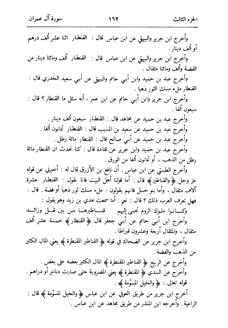 أما سَمِعت عدي بن زيد وهُوَ يَقُول: وَكَانُوا مُلُوك الرّوم تجبى إِلَيْهِم قناطيرها من بَين قل وزَائِد وأخرج ابْن أبي حَاتِم عَن أبي جَعْفَر قَالَ القنطار خَمْسَة عشر ألف مِثْقَال والمثقال أَرْبَعَة وعشرُون قيراطا