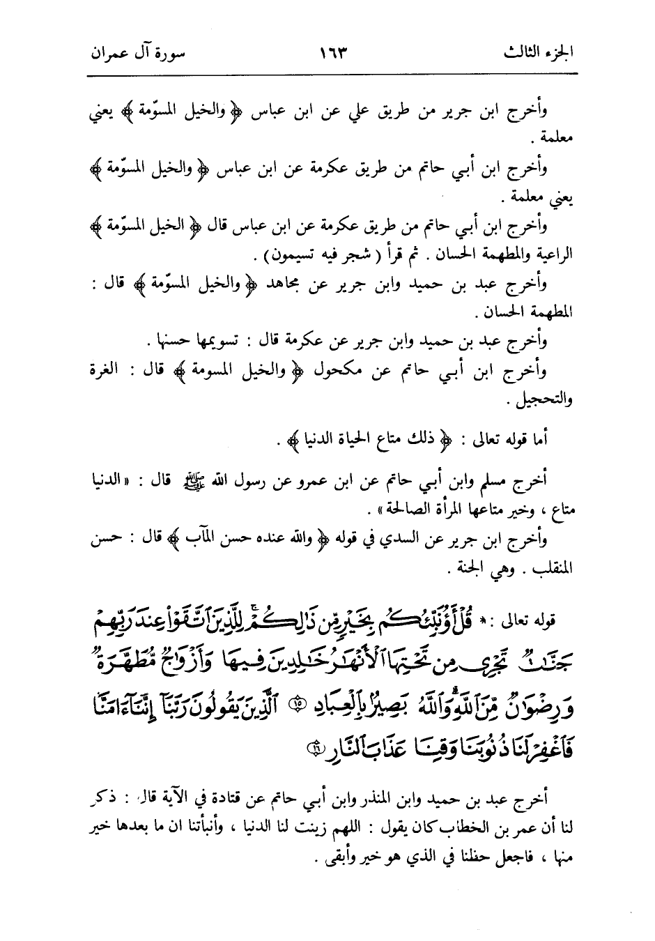 وأخرج ابْن أبي حَاتِم من طَرِيق عِكْرِمَة عَن ابْن عَبَّاس {وَالْخَيْل المسوّمة} يَعْنِي معلمة