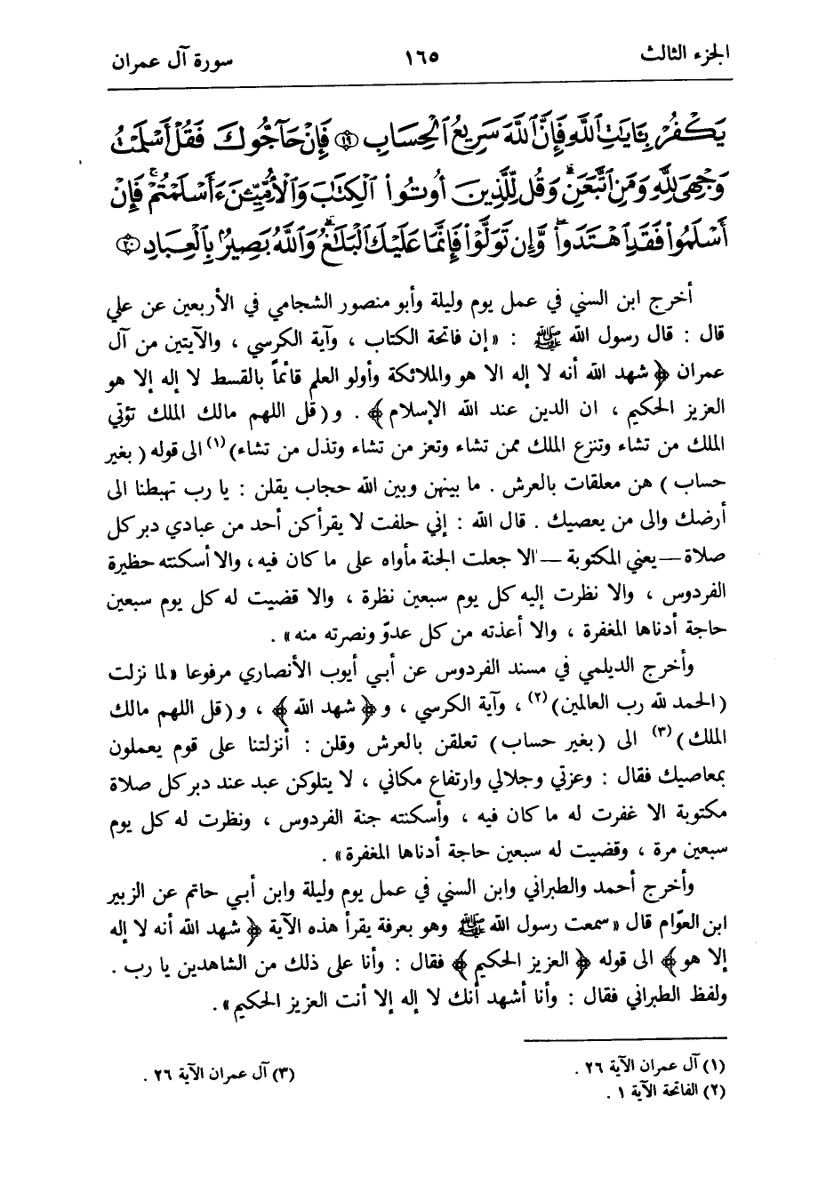 أخرج ابْن السّني فِي عمل يَوْم ولَيْلَة وأَبُو مَنْصُور الشجامي فِي الْأَرْبَعين عَن عَليّ قَالَ: قَالَ رَسُول الله صلى الله عَلَيْهِ وَسلم: إِن فَاتِحَة الْكتاب وَآيَة الْكُرْسِيّ والآيتين من آل عمرَان {شهد الله أَنه لَا إِلَه إِلَّا هُوَ وَالْمَلَائِكَة وأولو الْعلم قَائِما بِالْقِسْطِ لَا إِلَه إِلَّا هُوَ الْعَزِيز الْحَكِيم إِن الدّين عِنْد الله الْإِسْلَام}