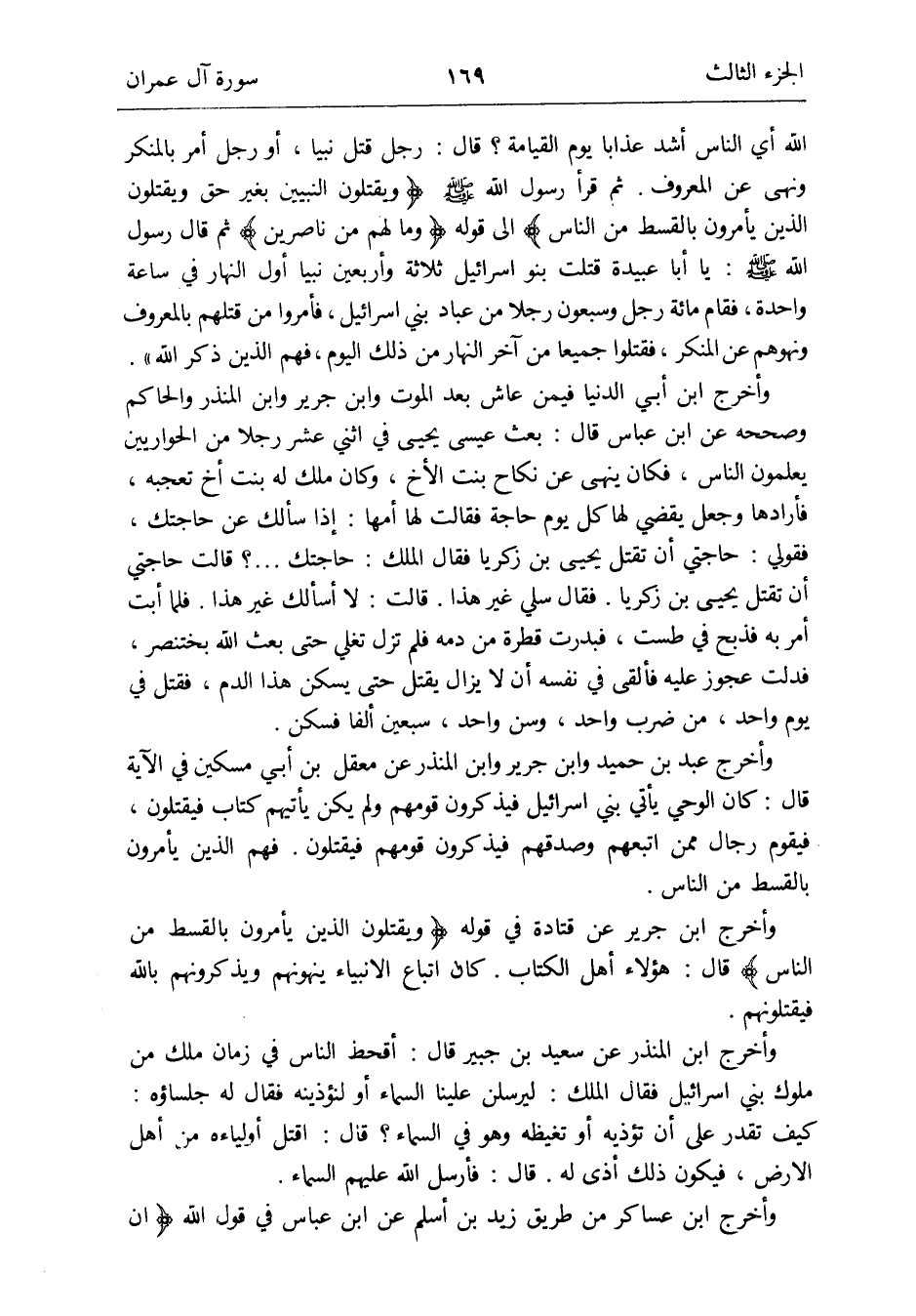 {وَيقْتلُونَ النَّبِيين بِغَيْر حق وَيقْتلُونَ الَّذين يأمرون بِالْقِسْطِ من النَّاس} إِلَى قَوْله {وَمَا لَهُم من ناصرين} ثمَّ قَالَ رَسُول الله صلى الله عَلَيْهِ وَسلم: يَا أَبَا عُبَيْدَة قتلت بَنو إِسْرَائِيل ثَلَاثَة وَأَرْبَعين نَبيا أول النَّهَار فِي سَاعَة وَاحِدَة فَقَامَ مائَة وَسَبْعُونَ رجلا من عباد بني إِسْرَائِيل فَأمروا من قَتلهمْ بِالْمَعْرُوفِ وَنَهَوْهُمْ عَن الْمُنكر فَقتلُوا جَمِيعًا من آخر النَّهَار من ذَلِك الْيَوْم فهم الَّذين ذكر الله