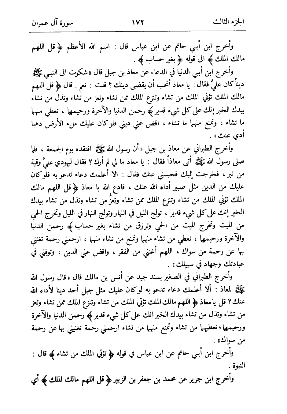 وَأخرج ابْن أبي حَاتِم عَن ابْن عَبَّاس قَالَ: اسْم الله الْأَعْظَم {قل اللَّهُمَّ مَالك الْملك} إِلَى قَوْله {بِغَيْر حِسَاب}