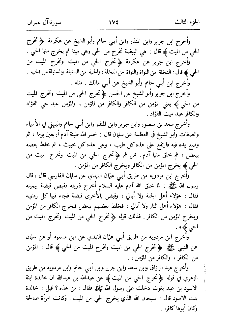 وَأخرج ابْن مرْدَوَيْه من طَرِيق أبي عُثْمَان النَّهْدِيّ عَن ابْن مَسْعُود أَو عَن سلمَان عَن النَّبِي صلى الله عَلَيْهِ وَسلم {وَتخرج الْحَيّ من الْمَيِّت وَتخرج الْمَيِّت من الْحَيّ} قَالَ: الْمُؤمن من الْكَافِر وَالْكَافِر من الْمُؤمن