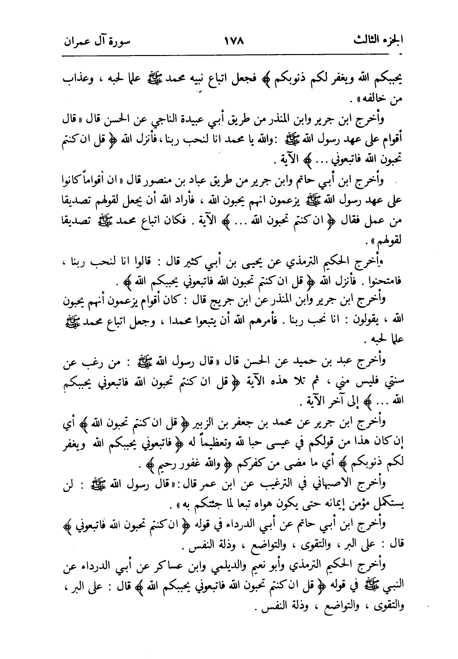 وَأخرج ابْن جرير عَن مُحَمَّد بن جَعْفَر بن الزبير {قل إِن كُنْتُم تحبون الله} أَي إِن كَانَ هَذَا من قَوْلكُم فِي عِيسَى حبا لله وتعظيماً لَهُ {فَاتبعُوني يحببكم الله وَيغْفر لكم ذنوبكم} أَي مَا مضى من كفركم {وَالله غَفُور رَحِيم}