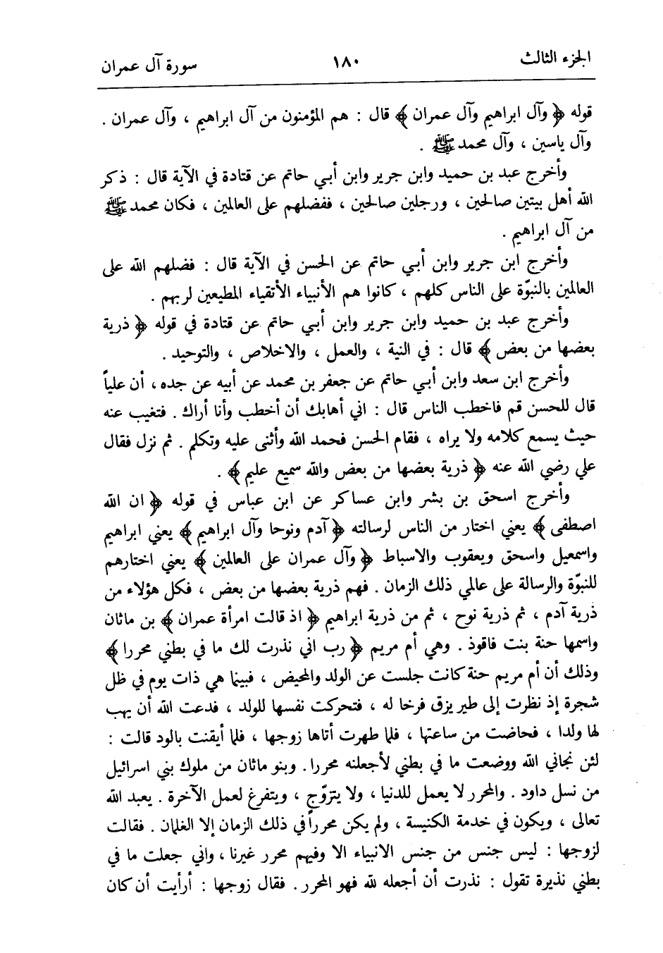 وَأخرج اسحق بن بشر وَابْن عَسَاكِر عَن ابْن عَبَّاس فِي قَوْله {إِن الله اصْطفى} يَعْنِي اخْتَار من النَّاس لرسالته {آدم ونوحاً وَآل إِبْرَاهِيم} يَعْنِي إِبْرَاهِيم وإسمعيل وَإِسْحَق وَيَعْقُوب والأسباط {وَآل عمرَان على الْعَالمين} يَعْنِي اخْتَارَهُمْ للنبوّة والرسالة على عالمي ذَلِك الزَّمَان