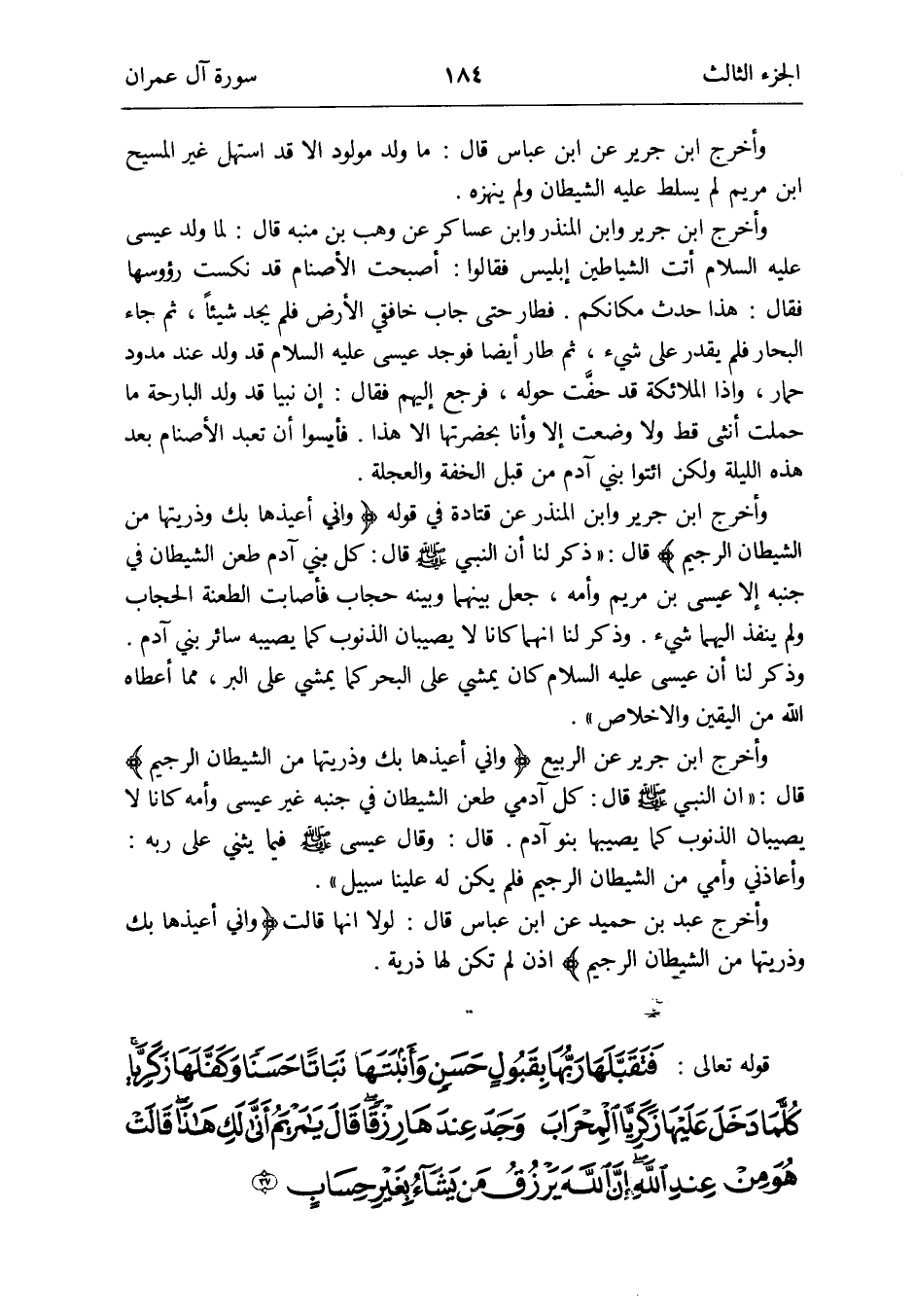 وَأخرج ابْن جرير وَابْن الْمُنْذر عَن قَتَادَة فِي قَوْله {وَإِنِّي أُعِيذهَا بك وذريتها من الشَّيْطَان الرَّجِيم} قَالَ: ذكر لنا أَن النَّبِي صلى الله عَلَيْهِ وَسلم قَالَ: كل بني آدم طعن الشَّيْطَان فِي جنبه إِلَّا عِيسَى بن مَرْيَم وَأمه جعل بَينهمَا وَبَينه حجاب فأصابت الطعنة الْحجاب وَلم ينفذ إِلَيْهِمَا شَيْء