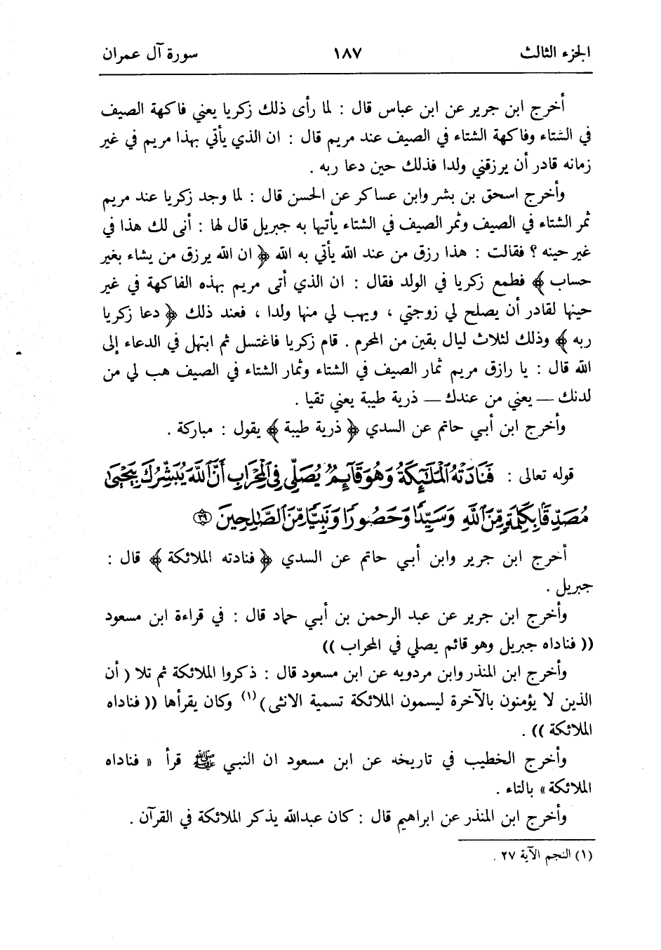 وَأخرج ابْن جرير عَن عبد الرَّحْمَن بن أبي حَمَّاد قَالَ: فِي قِرَاءَة ابْن مَسْعُود ((فناداه جِبْرِيل وَهُوَ قَائِم يُصَلِّي فِي الْمِحْرَاب)) وأخرج ابْن الْمُنْذر وَابْن مرْدَوَيْه عَن ابْن مَسْعُود قَالَ: ذكرُوا الْمَلَائِكَة ثمَّ تَلا (إِن الَّذين لَا يُؤمنُونَ بِالآخِرَة ليسمون الْمَلَائِكَة تَسْمِيَة الْأُنْثَى) (النَّجْم الْآيَة 27) وَكَانَ يَقْرَأها ((فناداه الْمَلَائِكَة))