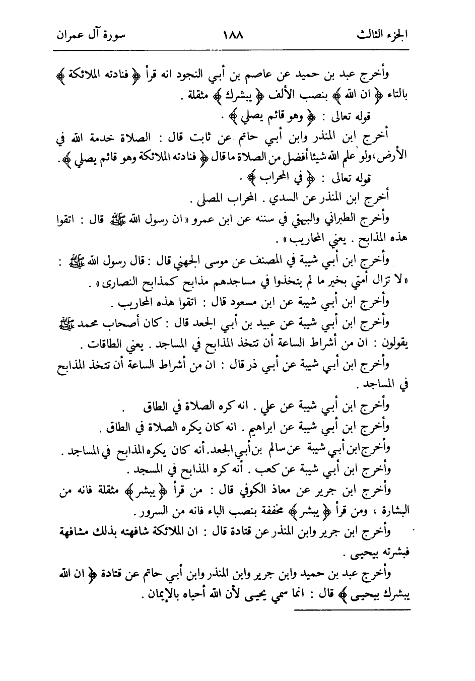 وَأخرج عبد بن حميد عَن عَاصِم بن أبي النجُود أَنه قَرَأَ {فنادته الْمَلَائِكَة} بِالتَّاءِ {أَن الله} بِنصب الْألف {يبشرك} مثقلة