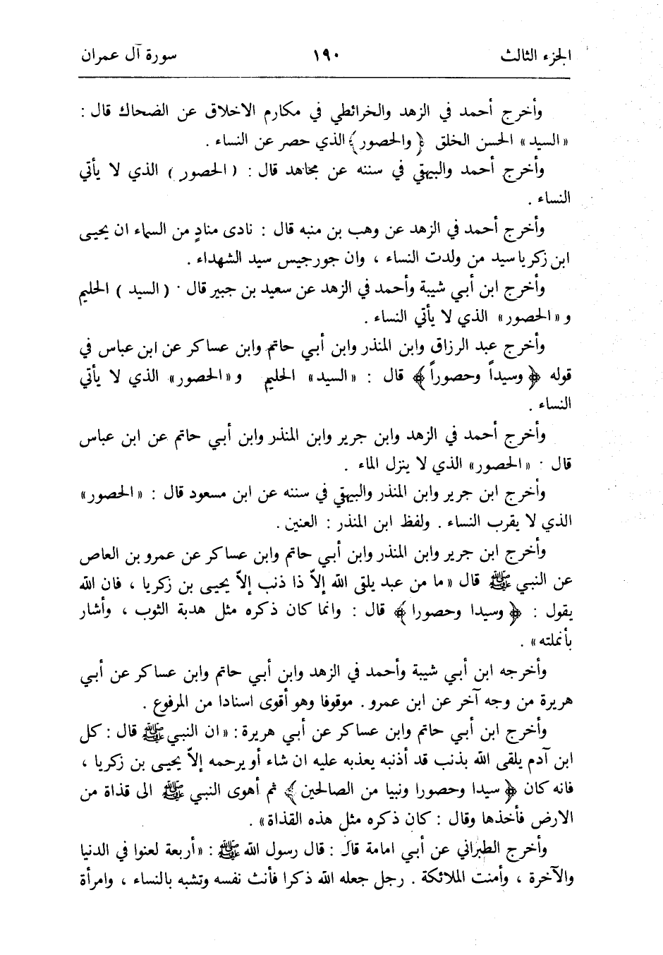 وَأخرج عبد الرَّزَّاق وَابْن الْمُنْذر وَابْن أبي حَاتِم وَابْن عَسَاكِر عَن ابْن عَبَّاس فِي قَوْله {وَسَيِّدًا وَحَصُورًا} قَالَ: السَّيِّد الْحَلِيم والحصور الَّذِي لَا يَأْتِي النِّسَاء