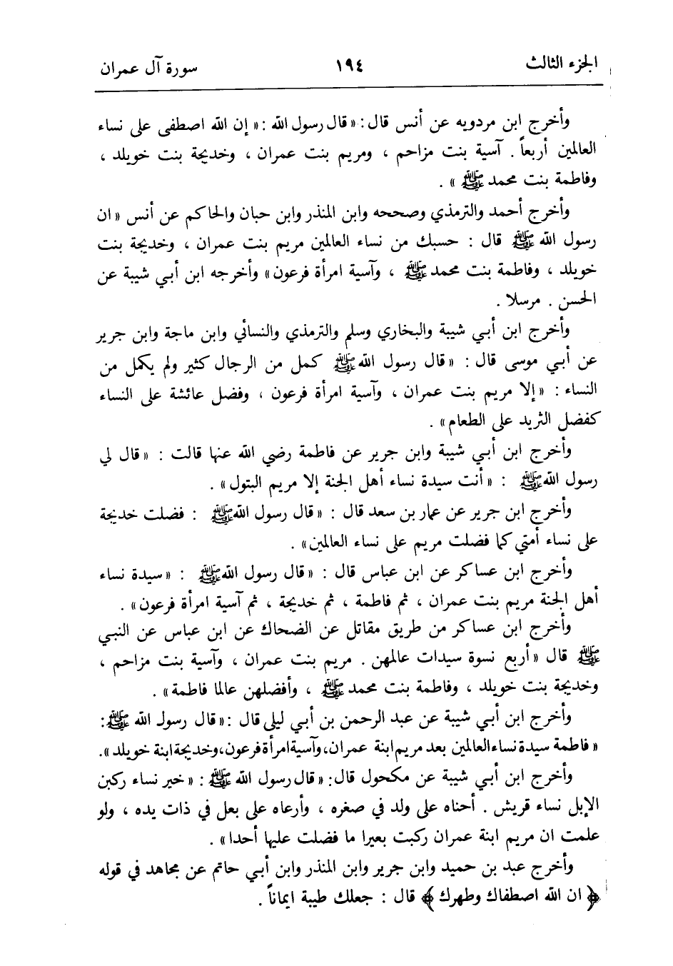 وَأخرج أَحْمد وَالتِّرْمِذِيّ وَصَححهُ وَابْن الْمُنْذر وَابْن حبَان وَالْحَاكِم عَن أنس أَن رَسُول الله صلى الله عَلَيْهِ وَسلم قَالَ: حَسبك من نسَاء الْعَالمين مَرْيَم بنت عمرَان وَخَدِيجَة بنت خويلد وَفَاطِمَة بنت مُحَمَّد صلى الله عَلَيْهِ وَسلم وآسية امْرَأَة فِرْعَوْن وَأخرجه ابْن أبي شيبَة عَن الْحسن