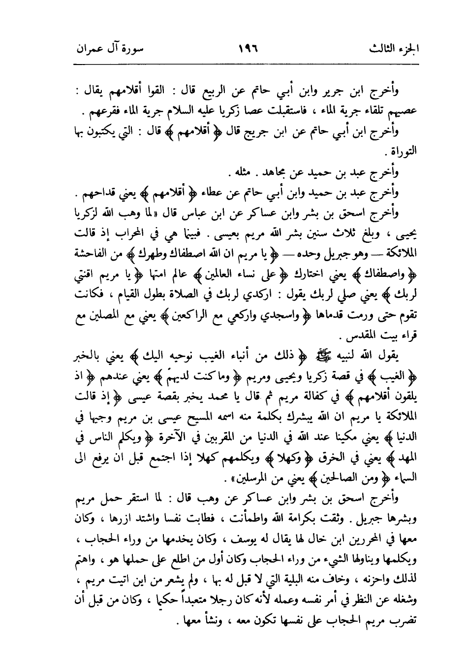 يَقُول الله لنَبيه صلى الله عَلَيْهِ وَسلم {ذَلِك من أنباء الْغَيْب نوحيه إِلَيْك} يَعْنِي بالْخبر {الْغَيْب} فِي قصَّة زَكَرِيَّا وَيحيى وَمَرْيَم {وَمَا كنت لديهم} يَعْنِي عِنْدهم {إِذْ يلقون أقلامهم} فِي كَفَالَة مَرْيَم ثمَّ قَالَ يَا مُحَمَّد يخبر بِقصَّة عِيسَى {إِذْ قَالَت الْمَلَائِكَة يَا مَرْيَم إِن الله يبشرك بِكَلِمَة مِنْهُ اسْمه الْمَسِيح عِيسَى ابْن مَرْيَم وجيهاً فِي الدُّنْيَا} يَعْنِي مكيناً عِنْد الله فِي الدُّنْيَا من المقربين فِي الْآخِرَة {ويكلم النَّاس فِي المهد} يَعْنِي فِي الْخرق {وكهلاً} ويكلمهم كهلاً إِذا اجْتمع قبل أَن يرفع إِلَى السَّمَاء {وَمن الصَّالِحين} يَعْنِي من الْمُرْسلين