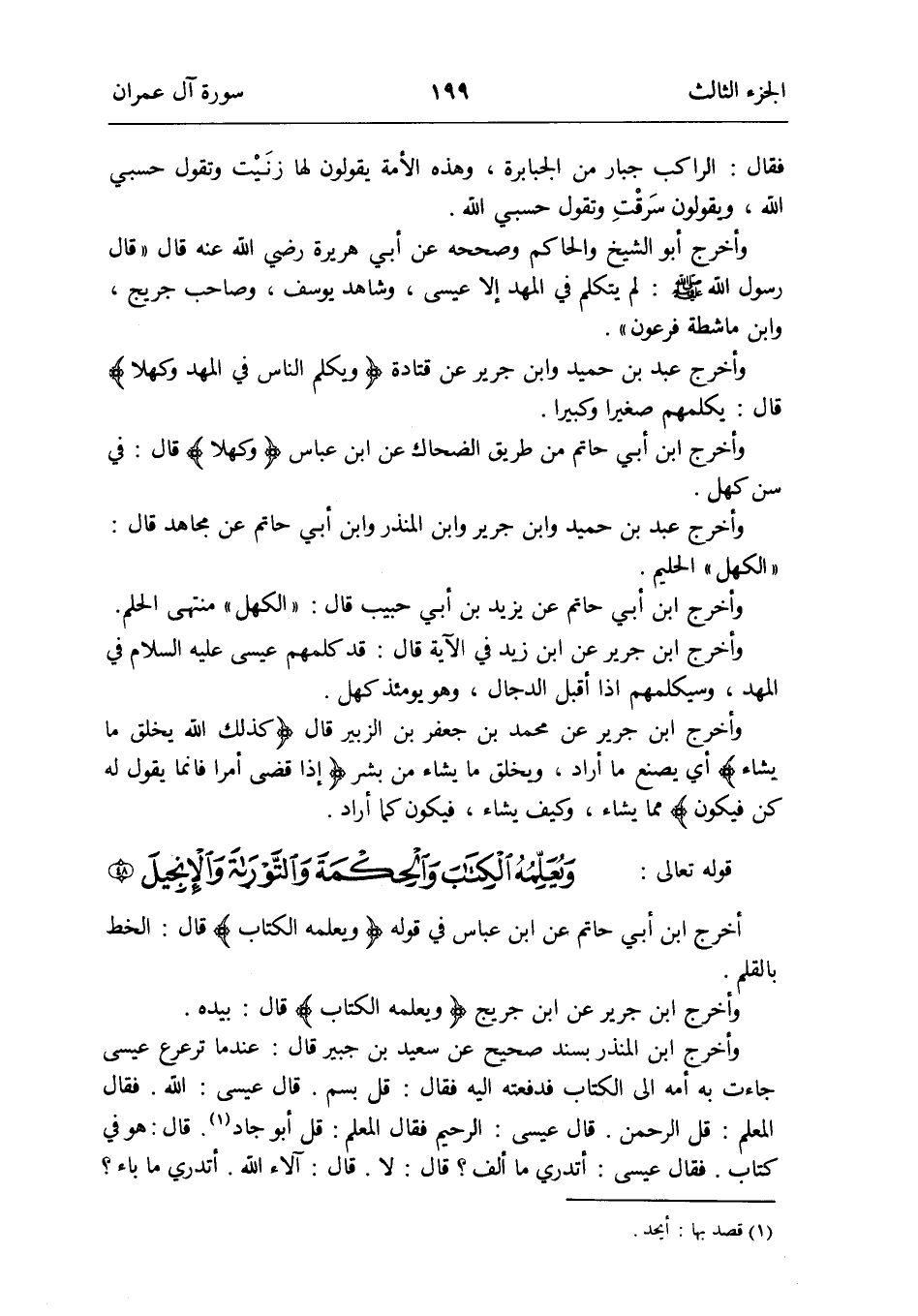 وَأخرج عبد بن حميد وَابْن جرير عَن قَتَادَة {ويكلم النَّاس فِي المهد وكهلاً} قَالَ: يكلمهم صَغِيرا وكبيراً