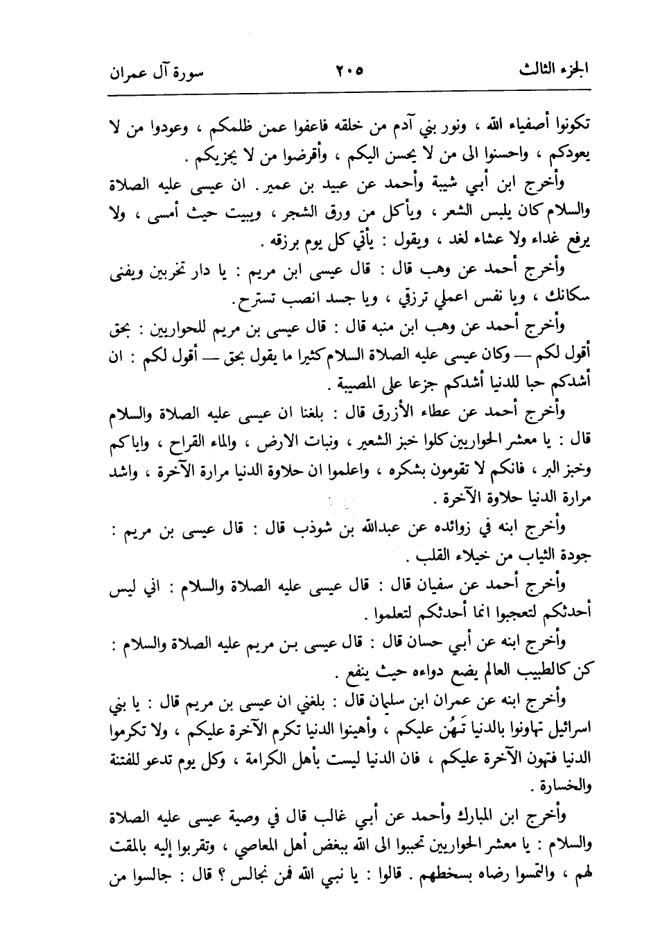 وَأخرج أَحْمد عَن سُفْيَان قَالَ: قَالَ عِيسَى عَلَيْهِ الصَّلَاة وَالسَّلَام: إِنِّي لَيْسَ أحدثكُم لتعجبوا إِنَّمَا أحدثكُم لِتَعْلَمُوا