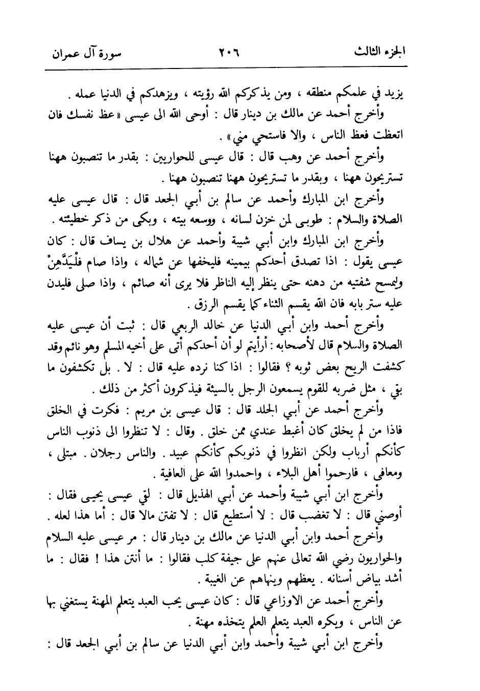 وَأخرج ابْن الْمُبَارك وَابْن أبي شيبَة وَأحمد عَن هِلَال بن يسَاف قَالَ: كَانَ عِيسَى يَقُول: إِذا تصدق أحدكُم بِيَمِينِهِ فليخفها عَن شِمَاله وَإِذا صَامَ فلْيَدَّهِنْ وليمسح شَفَتَيْه من دهنه حَتَّى ينظر إِلَيْهِ النَّاظر فَلَا يرى أَنه صَائِم وَإِذا صلى فليدن عَلَيْهِ ستر بَابه فَإِن الله يقسم الثَّنَاء كَمَا يقسم الرزق