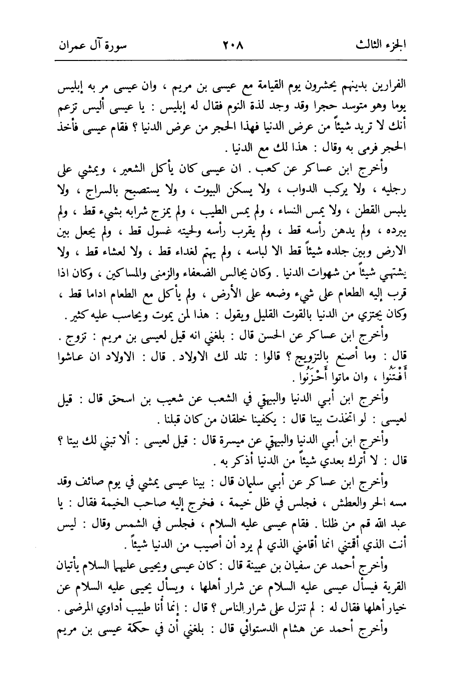 الفرارين بدينهم يحشرون يَوْم الْقِيَامَة مَعَ عِيسَى بن مَرْيَم وَأَن عِيسَى مر بِهِ إِبْلِيس يَوْمًا وَهُوَ مُتَوَسِّد حجرا وَقد وجد لَذَّة النّوم فَقَالَ لَهُ إِبْلِيس: يَا عِيسَى أَلَيْسَ تزْعم أَنَّك لَا تُرِيدُ شَيْئا من عرض الدُّنْيَا فَهَذَا الْحجر من عرض الدُّنْيَا فَقَامَ عِيسَى فَأخذ الْحجر فَرمى بِهِ وَقَالَ: هَذَا لَك مَعَ الدُّنْيَا