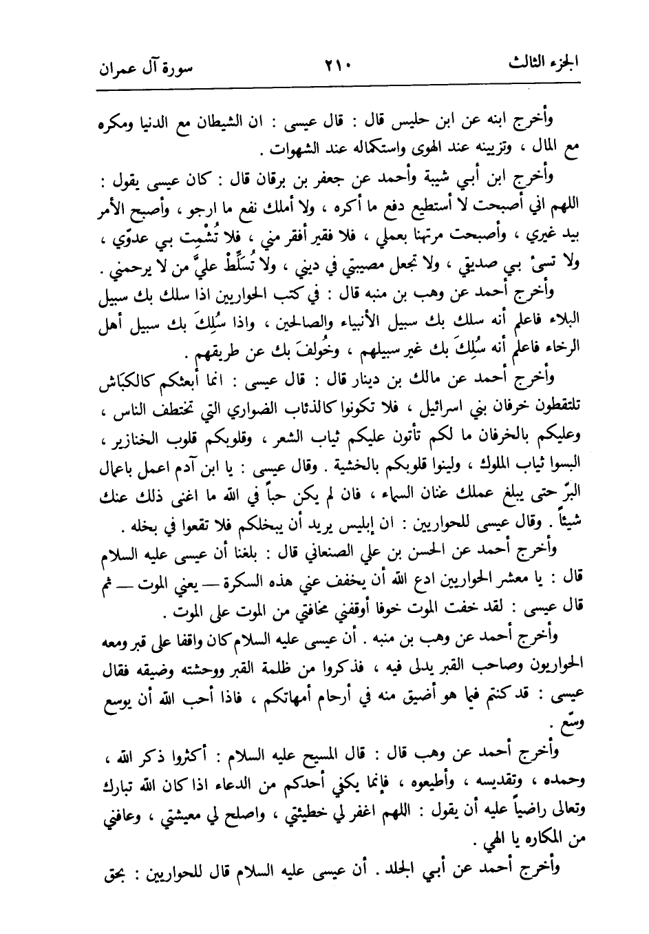 وَأخرج ابْن أبي شيبَة وَأحمد عَن جَعْفَر بن برْقَان قَالَ: كَانَ عِيسَى يَقُول: اللَّهُمَّ إِنِّي أَصبَحت لَا أَسْتَطِيع دفع مَا أكره وَلَا أملك نفع مَا ارجو وَأصْبح الْأَمر بيد غَيْرِي وأصبحت مرتهنا بعملي فَلَا فَقير أفقر مني فَلَا تُشْمِت بِي عدوّي وَلَا تسيء بِي صديقي وَلَا تجْعَل مصيبتي فِي ديني وَلَا تُسَلِّطْ عليَّ من لَا يرحمني