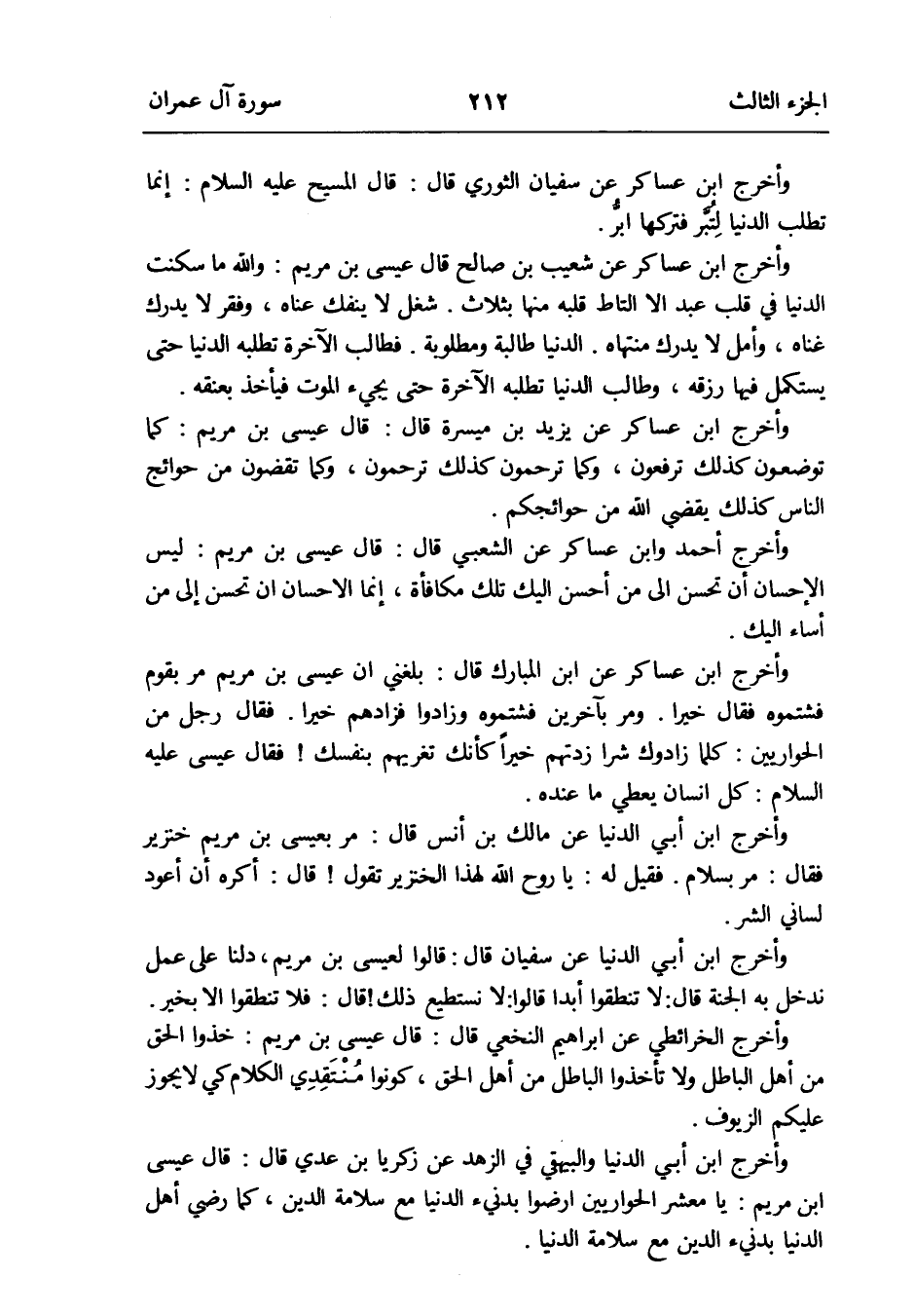 وَأخرج ابْن عَسَاكِر عَن سُفْيَان الثَّوْريّ قَالَ: قَالَ الْمَسِيح عَلَيْهِ السَّلَام: إِنَّمَا تطلب الدُّنْيَا لِتُبرَّ فَتَركهَا ابرُّ