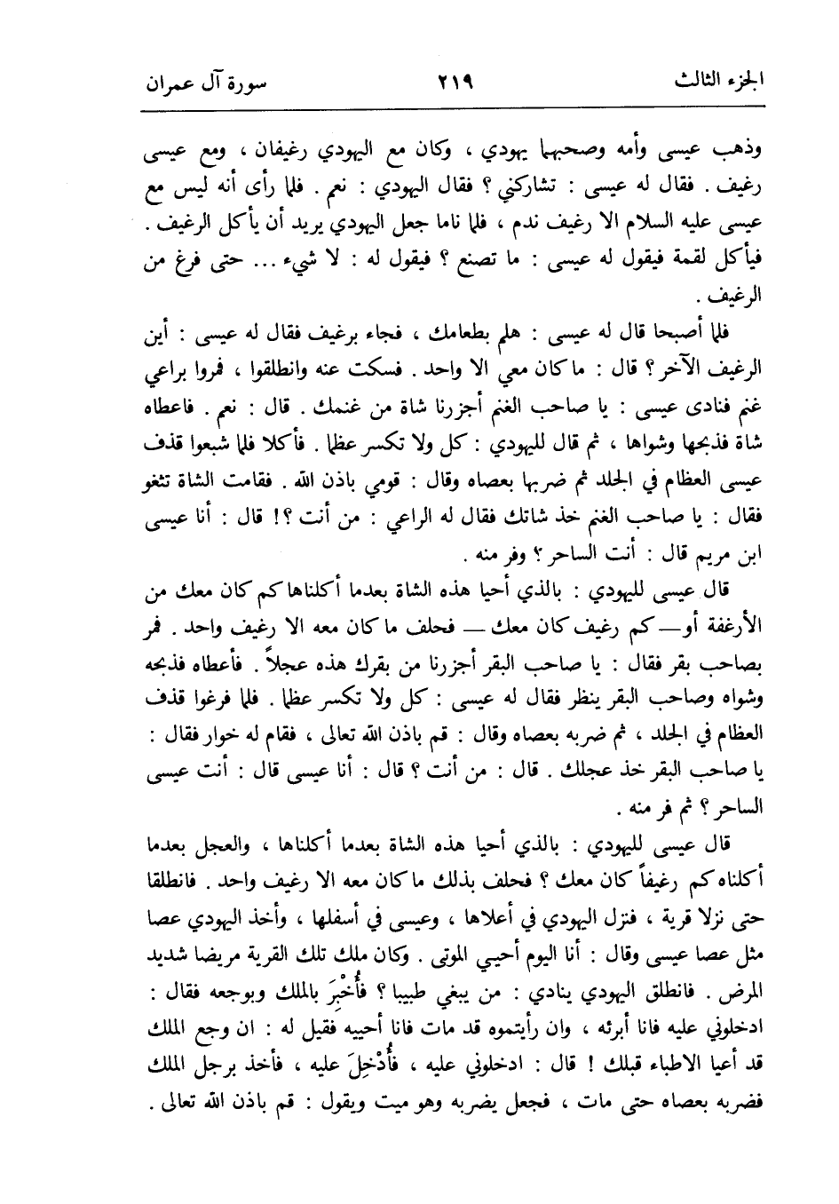 قَالَ عِيسَى لِلْيَهُودِيِّ: بِالَّذِي أَحْيَا هَذِه الشَّاة بعد مَا أكلناها والعجل بَعْدَمَا أكلناه كم رغيفاً كَانَ مَعَك فَحلف بذلك مَا كَانَ مَعَه إِلَّا رغيف وَاحِد