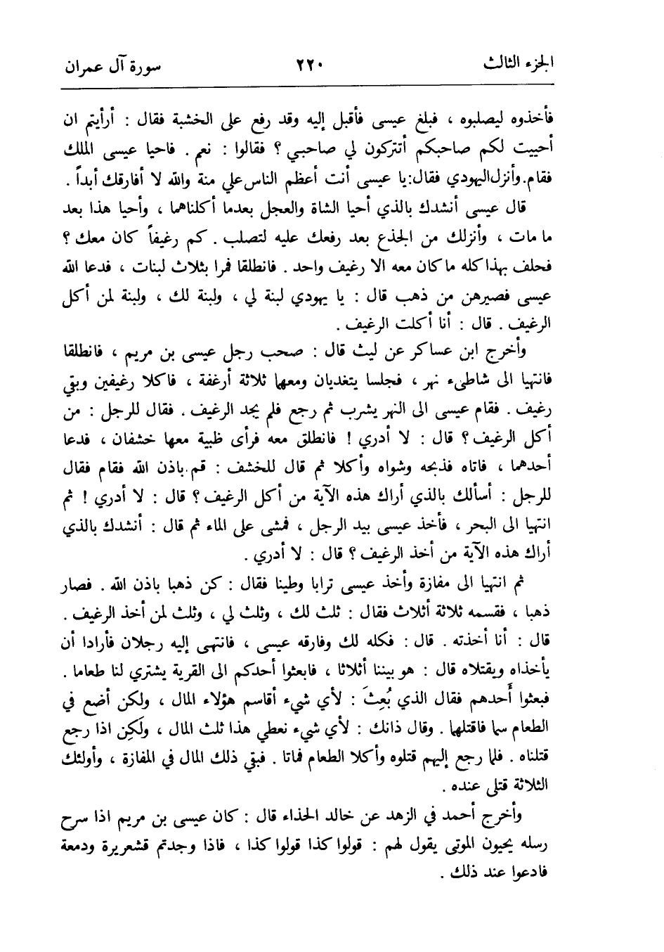 فَقَالَ للرجل: من أكل الرَّغِيف قَالَ: لَا أَدْرِي فَانْطَلق مَعَه فَرَأى ظَبْيَة مَعهَا خشفان فَدَعَا أَحدهمَا فَأَتَاهُ فذبحه وشواه وأكلا ثمَّ قَالَ للخشف: قُم بِإِذن الله فَقَامَ فَقَالَ للرجل: أَسأَلك بِالَّذِي أَرَاك هَذِه الْآيَة من أكل الرَّغِيف قَالَ: لَا أَدْرِي ثمَّ انتهيا إِلَى الْبَحْر فَأخذ عِيسَى بيد الرجل فَمشى على المَاء ثمَّ قَالَ: أنْشدك بِالَّذِي أَرَاك هَذِه الْآيَة من أَخذ الرَّغِيف قَالَ: لَا أَدْرِي