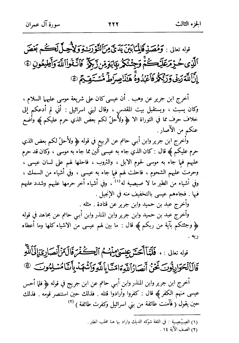 وَأخرج ابْن جرير وَابْن أبي حَاتِم عَن الرّبيع فِي قَوْله {ولأحلّ لكم بعض الَّذِي حرم عَلَيْكُم} قَالَ: كَانَ الَّذِي جَاءَ بِهِ عِيسَى أَلين مِمَّا جَاءَ بِهِ مُوسَى وَكَانَ قد حرم عَلَيْهِم فِيمَا جَاءَ بِهِ مُوسَى لُحُوم الْإِبِل والثروب فأحلهما لَهُم على لِسَان عِيسَى وَحرمت عَلَيْهِم الشحوم فأحلت لَهُم فِيمَا جَاءَ بِهِ عِيسَى وَفِي أَشْيَاء من السّمك وَفِي أَشْيَاء من الطير مَا لَا صيصية لَهُ (الصيصية فِي اللُّغَة شَوْكَة الديك وَأَرَادَ بهَا هُنَا مخلب الطير) وَفِي أَشْيَاء أخر حرمهَا عَلَيْهِم وشدد عَلَيْهِم فِيهَا
