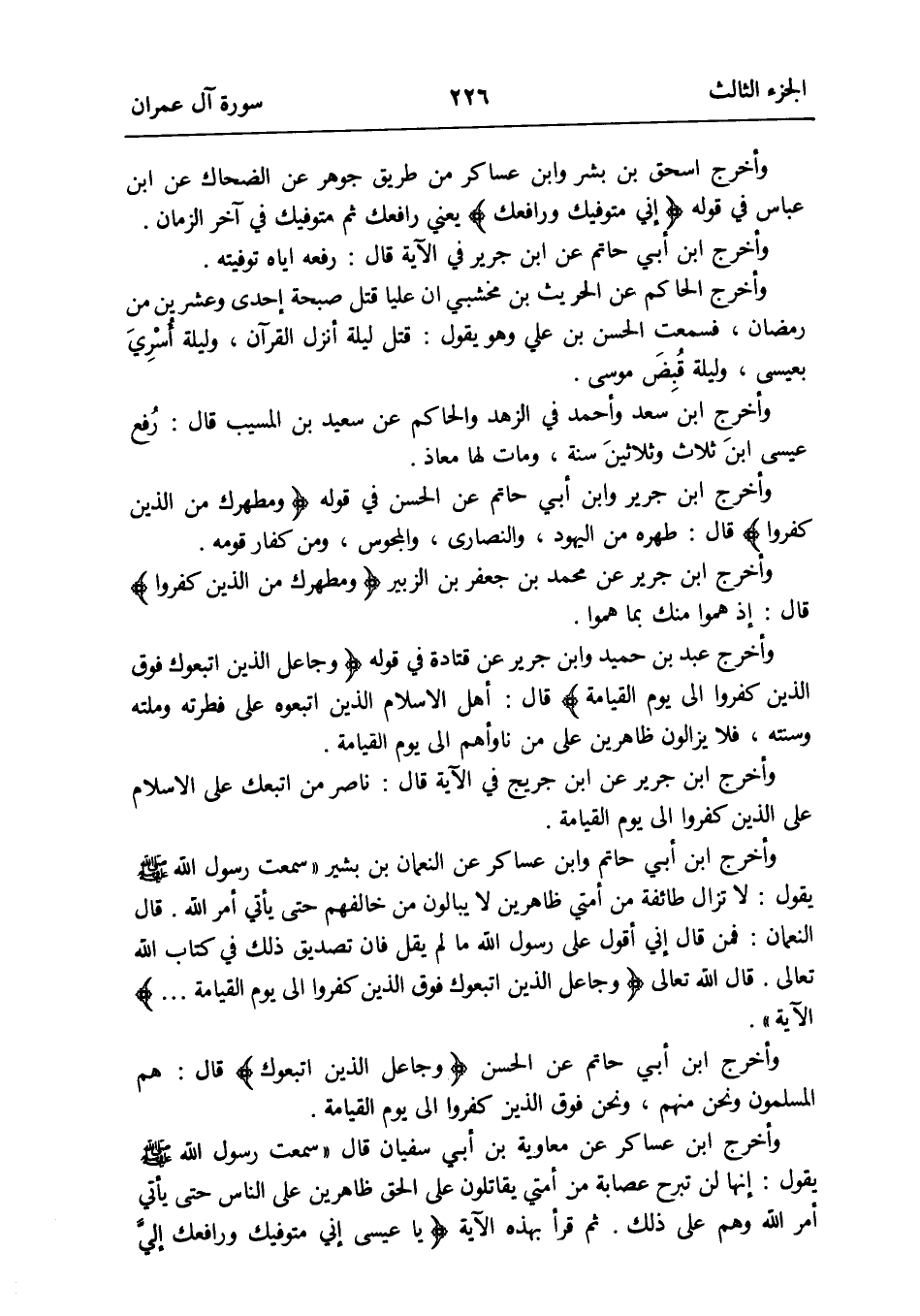 ثمَّ قَرَأَ بِهَذِهِ الْآيَة {يَا عِيسَى إِنِّي متوفيك ورافعك إليَّ ومطهرك من الَّذين كفرُوا وجاعل الَّذين اتبعوك فَوق الَّذين كفرُوا إِلَى يَوْم الْقِيَامَة}