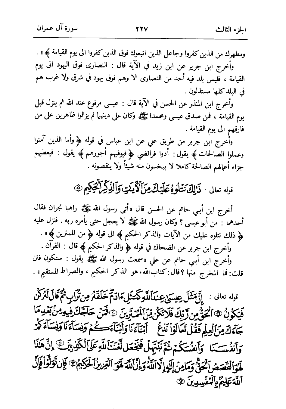 فَنزل عَلَيْهِ {ذَلِك نتلوه عَلَيْك من الْآيَات وَالذكر الْحَكِيم} إِلَى قَوْله {من الممترين}
