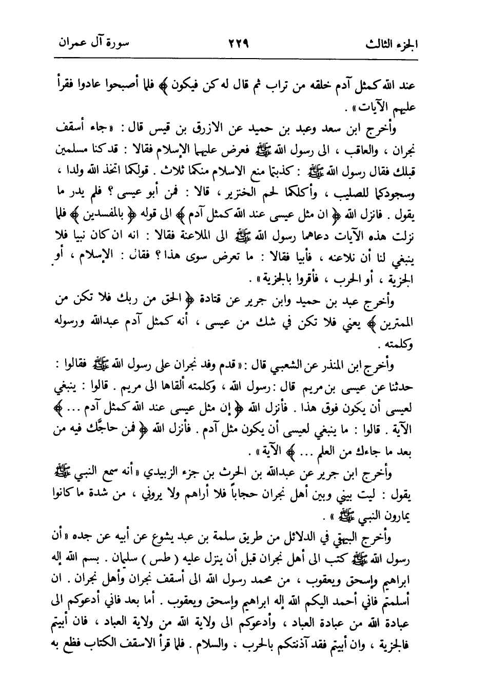 وَأخرج ابْن جرير عَن عبد الله بن الْحَرْث بن جُزْء الزبيدِيّ أَنه سمع النَّبِي صلى الله عَلَيْهِ وَسلم يَقُول: لَيْت بيني وَبَين أهل نَجْرَان حِجَابا فَلَا أَرَاهُم وَلَا يروني من شدَّة مَا كَانُوا يمارون النَّبِي صلى الله عَلَيْهِ وَسلم